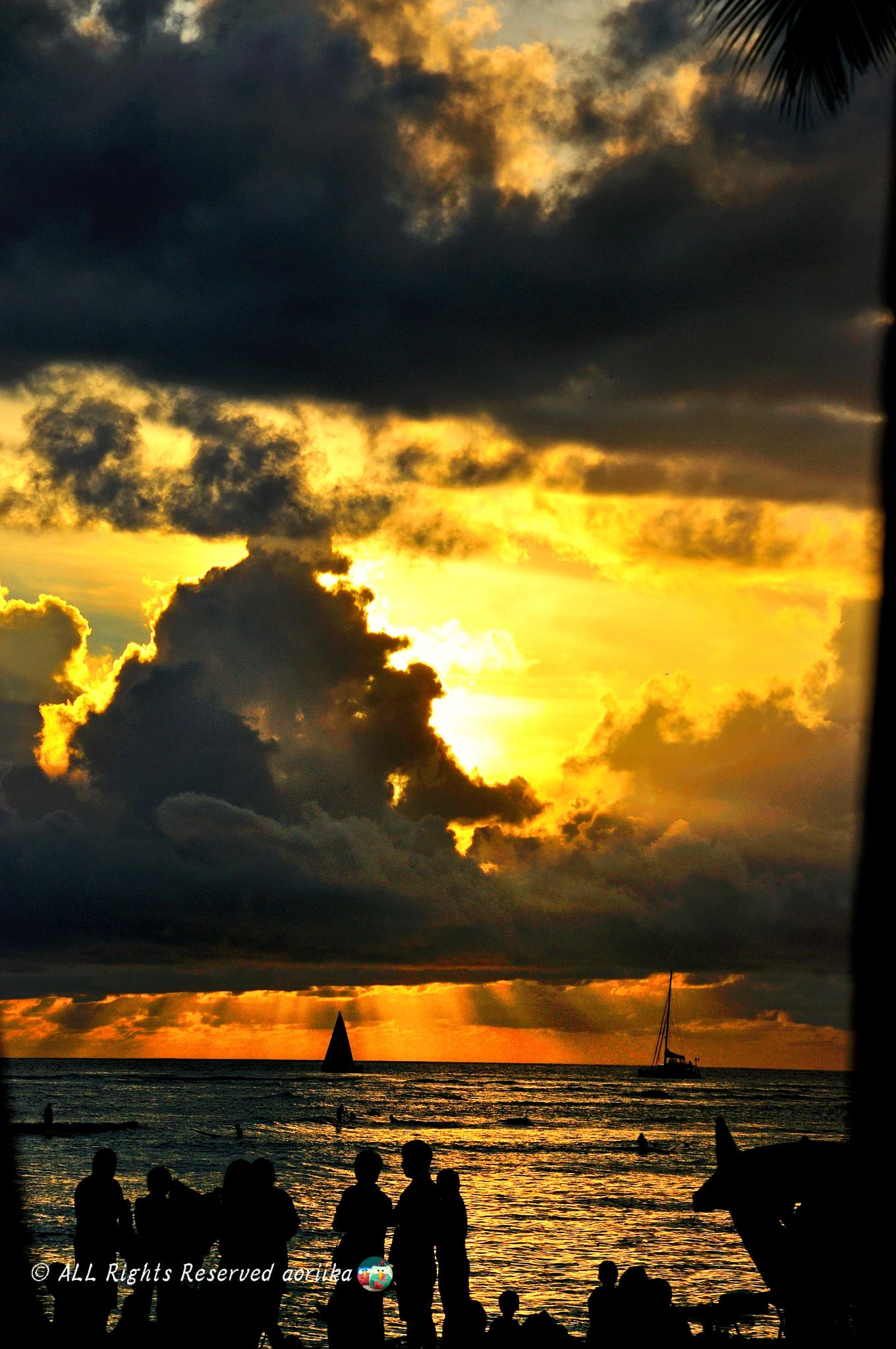 Statue "Duke Kahanamoku像の付近、夕日を眺める人々。
