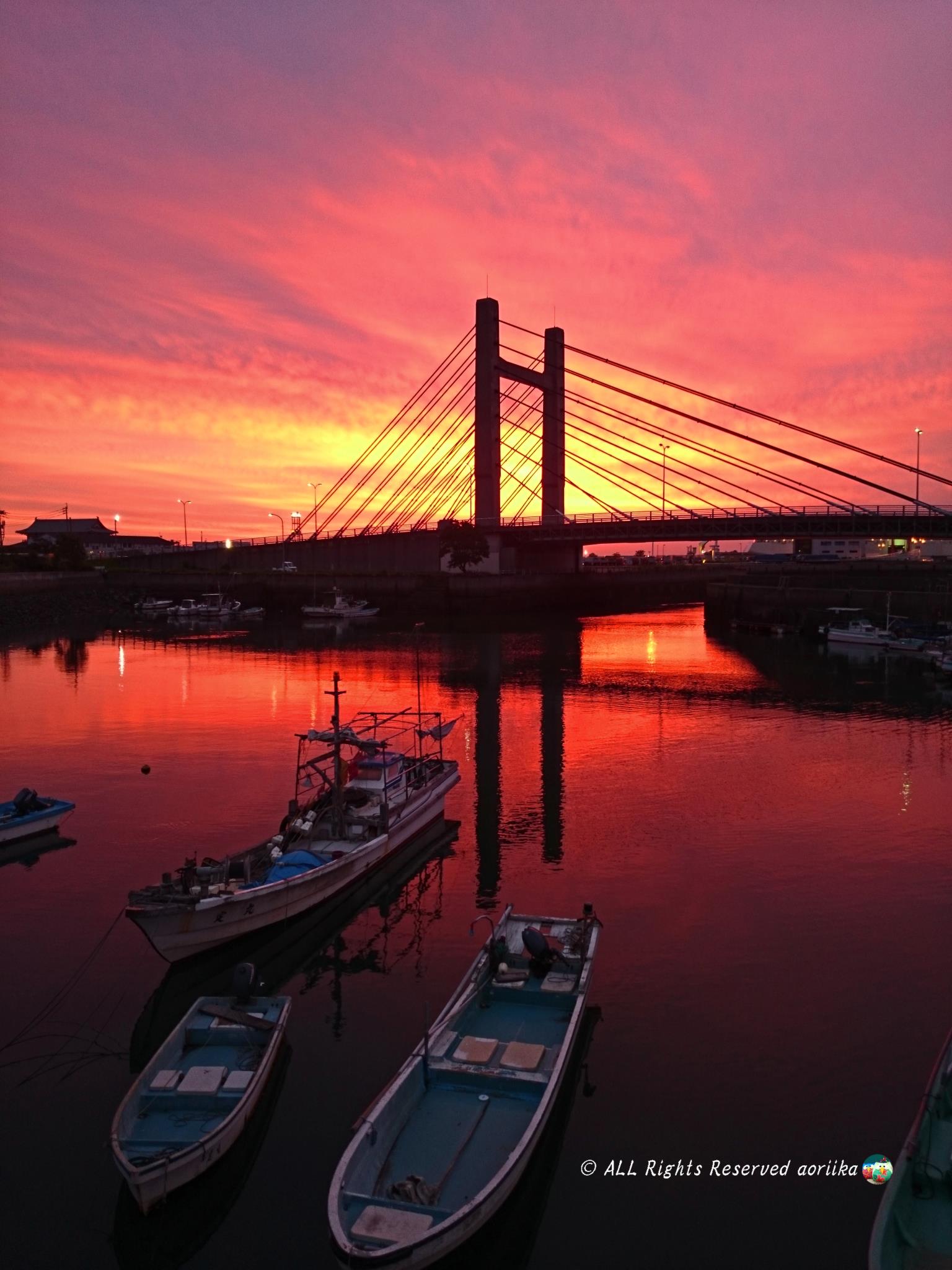 新門司港でフェリーから下船、東の空を仰ぐと何とも言い難い色。最寄りの漁港に停車して、雲の間からの日の出を期待しつつも、朝焼けだけに終わる。
