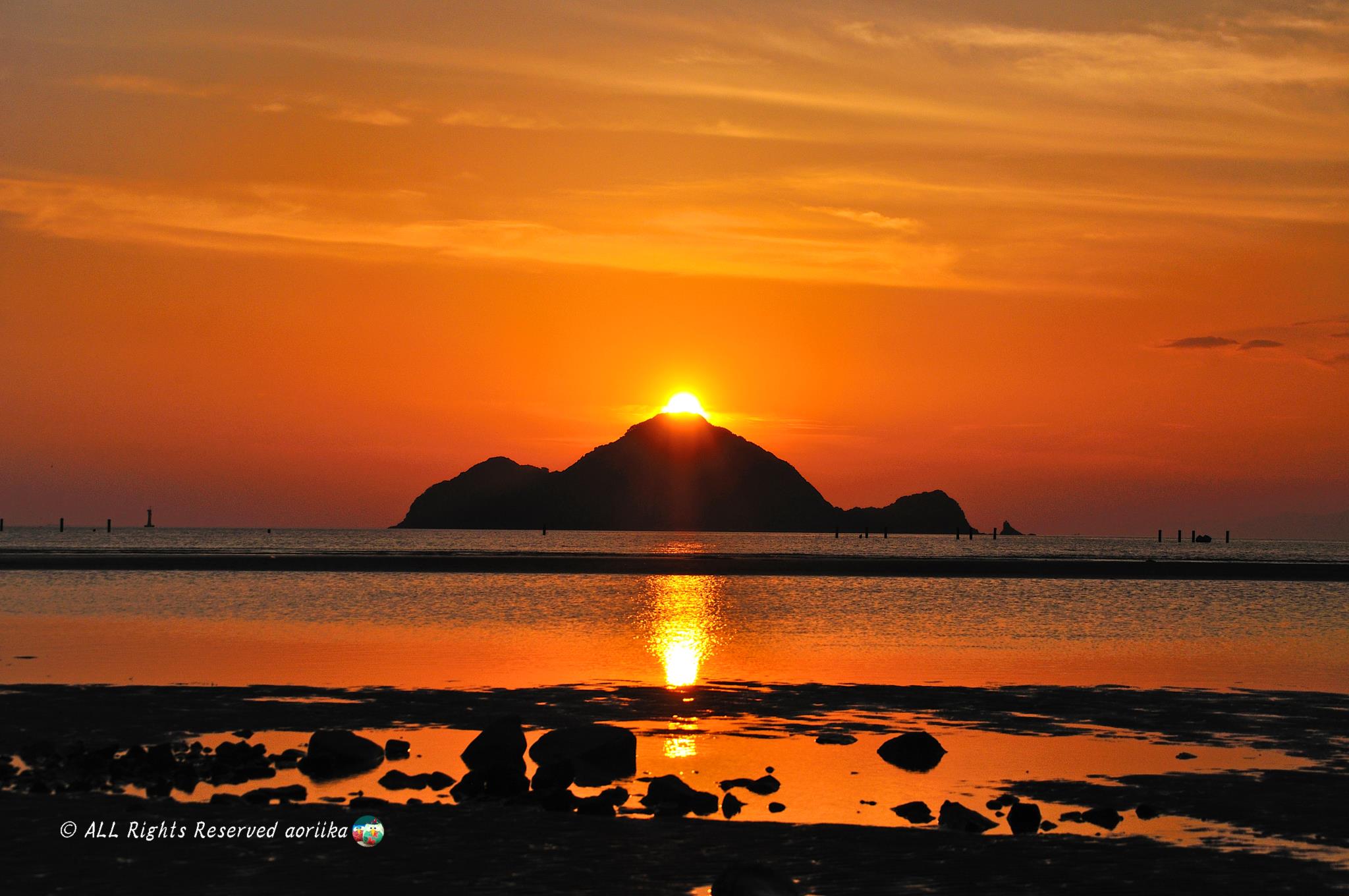 遠浅の海岸の沖きには小島があり、今日はどうだろう?と思いつつ到着。日の出・日の入りマップのとおりドンピシャの位置!(^^)!