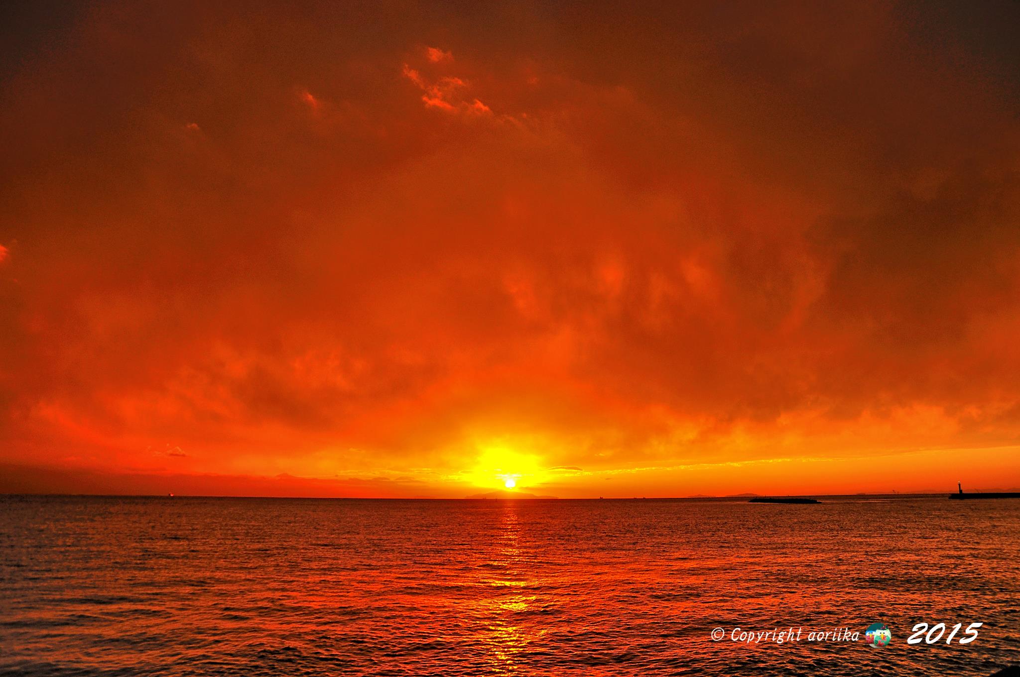 諦めつつも、日の入りを待つ事しばし、小豆島の辺りから夕日が現れた。