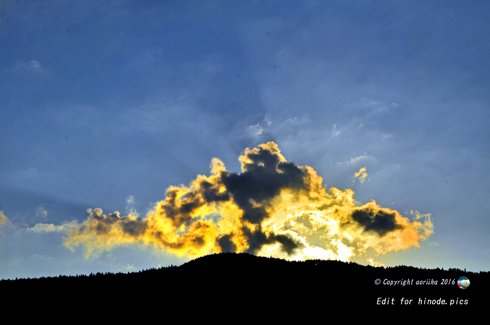 背後から陽光に照らされた雲、山の向こう側からこちらに向かってくる古来伝承の巨人「ダイダラボッチ」が現れた。。。。