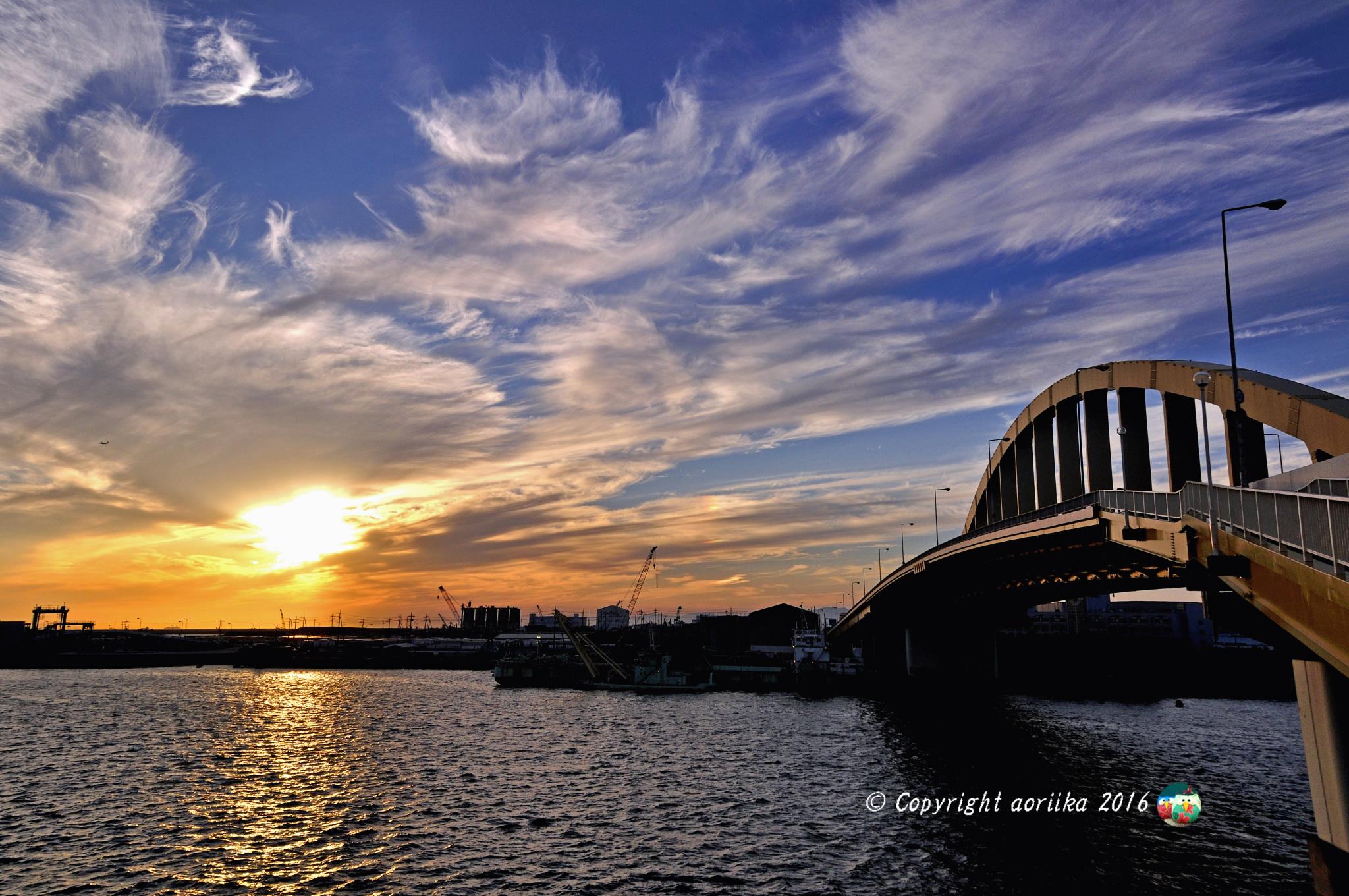 埋め立て地を結ぶ橋の袂で、もう少し右側に太陽が沈んで欲しいと思いながら、ファインダーを覗く。。。