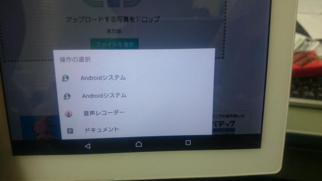 このショットは、スマホ撮影タブレットまたはスマホで写真をpostするとき、事前に撮影保存したファイルが選択できないの。