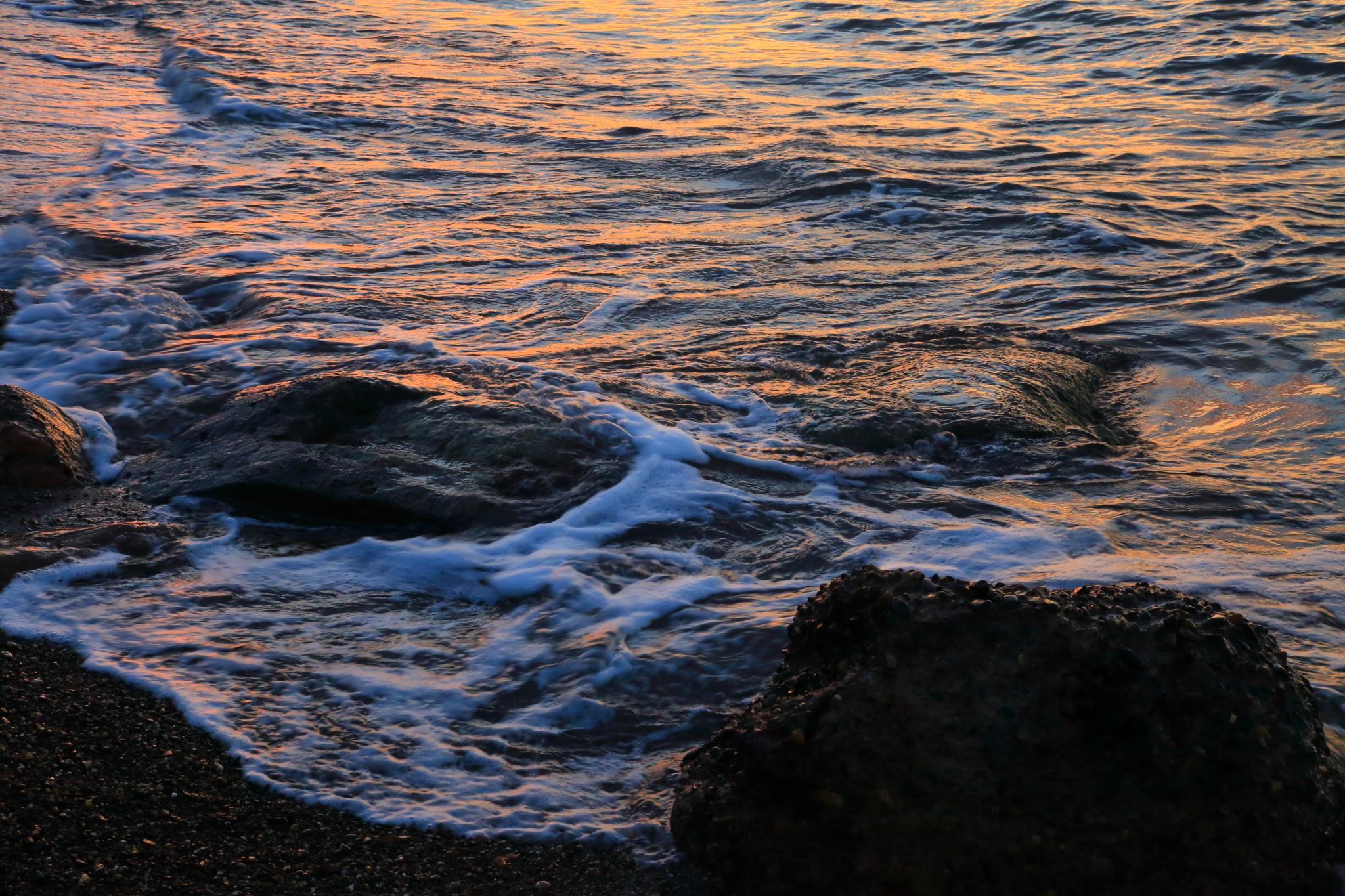 岩と波に夕日にあたってよい感じですね 好きな写真です
