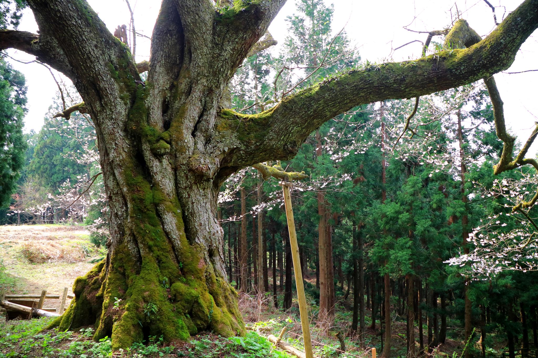 この神大桜の構図が一番好きな写真でした 幹の太さにある苔と、杉の緑に桜の花か良いアングルですね