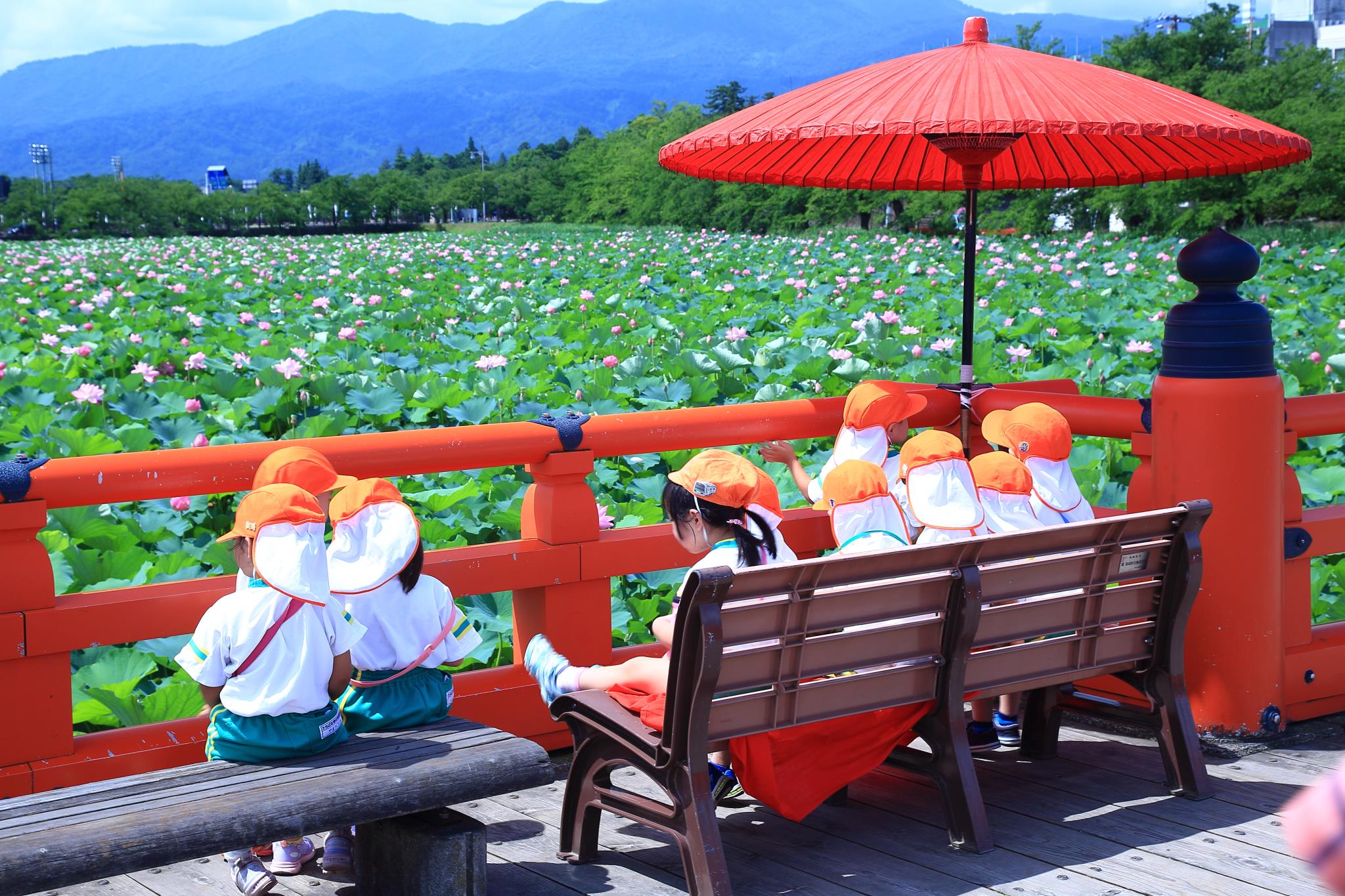園児たちのオレンジの帽子、蛇の目傘の赤と朱色の欄干、そして背景には一面のハスの花。素晴らしく思います。