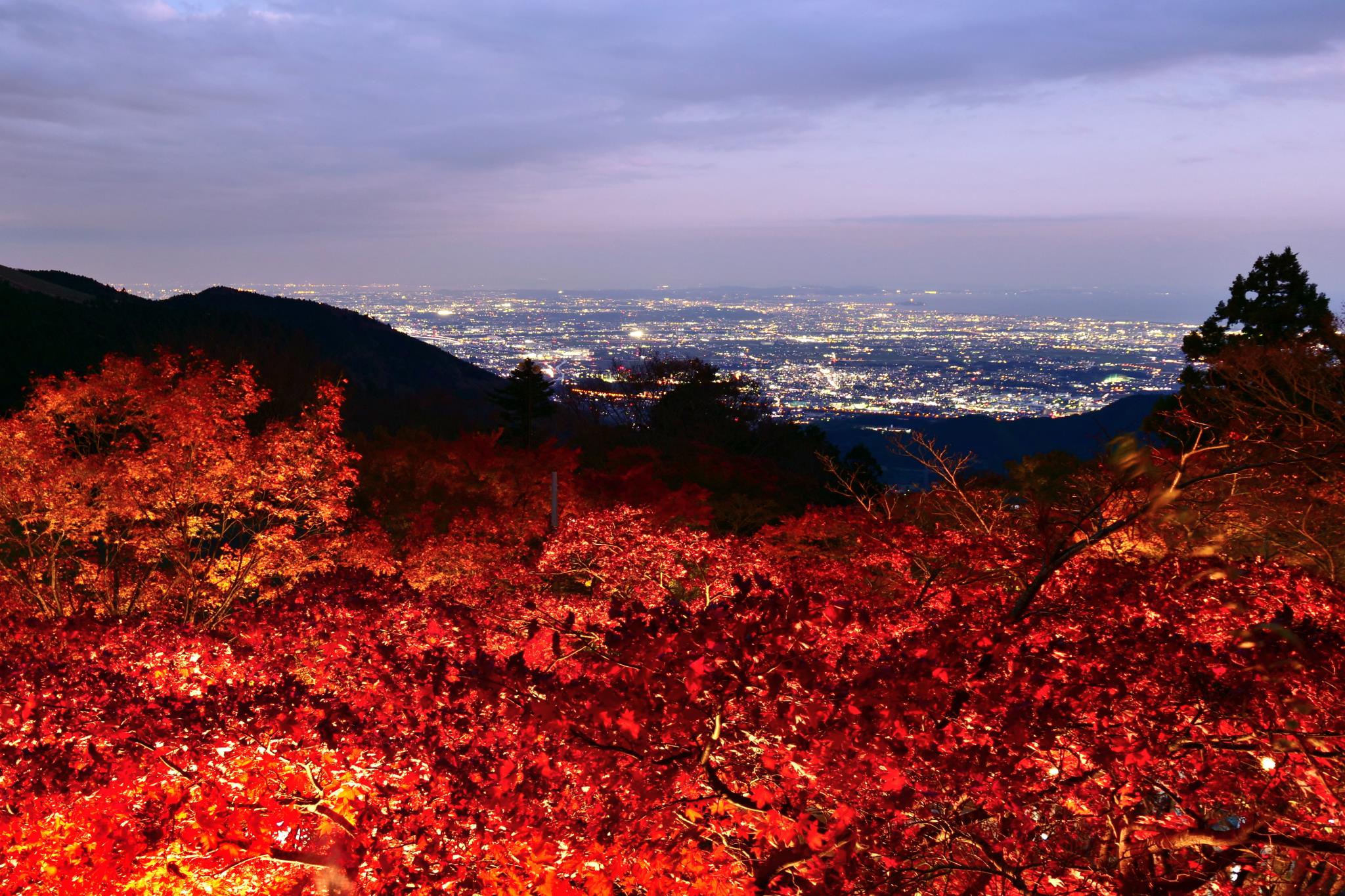遠くの街灯りと紅葉が綺麗にコラボできましたね。