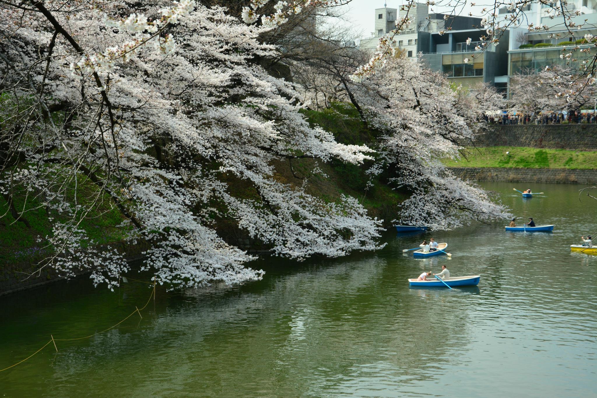 桜の枝が堀の水に浸かりそうですね。たまにはボートの上から見上げて眺めてみたいですね。