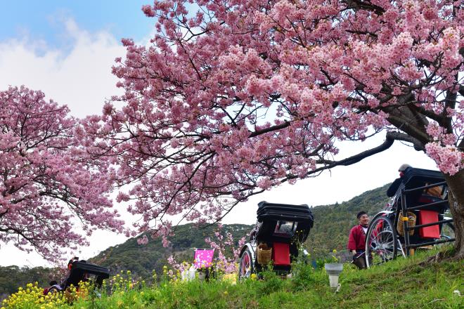 満開の河津桜に人力車、菜の花も咲いて春満載です。