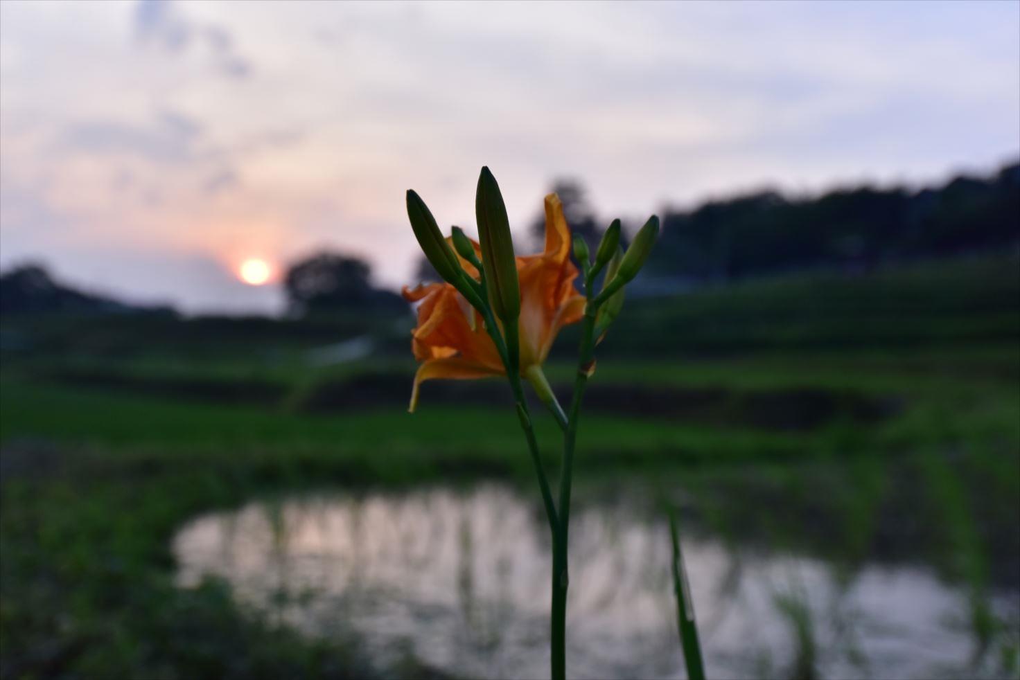 ノカンゾウとたんぼの反射を狙って降りて行ったら、偶然にも太陽がまだ待っていてくれましたよ。