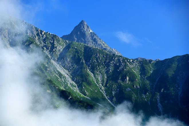 この時だけの青空、この5分後は下のガスが湧き上がって槍ヶ岳だけでなく周りもすっぽりガスの中になりました。
