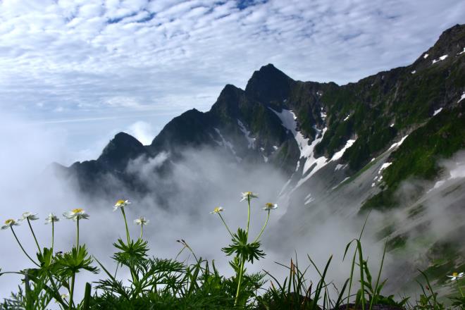 上空を覆う分厚い雲とガスの合間に見える前穂高と