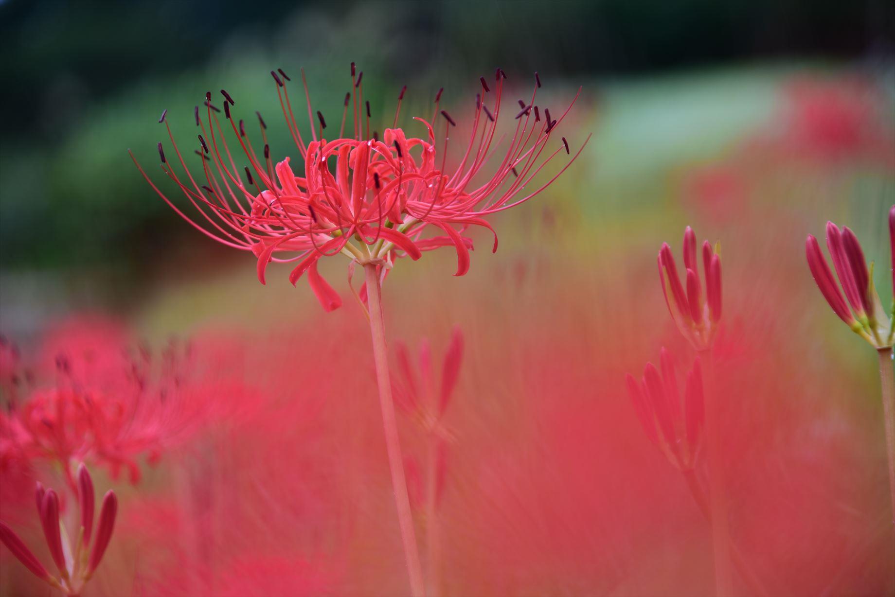 雨空なので全体に光が回り柔らかい感じになります。さらに前ボケに手前の彼岸花にレンズがくっつく位近づけて、ピントは1本の花に合わせています。