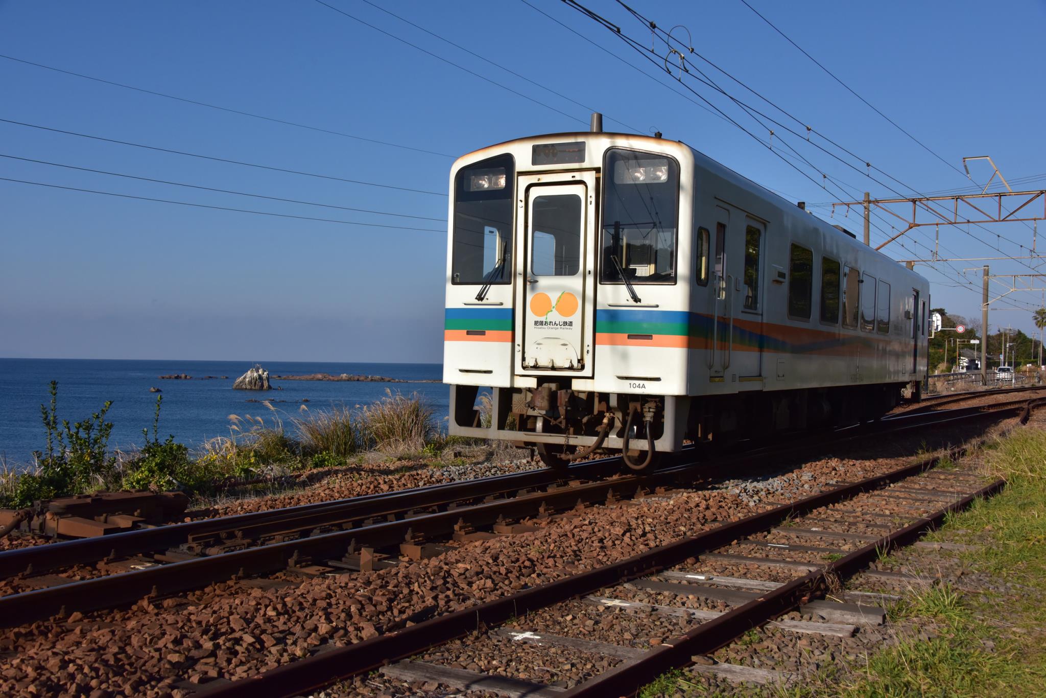 海岸線を走る1両編成の電車、いかにもローカル線という感じがいいですね。