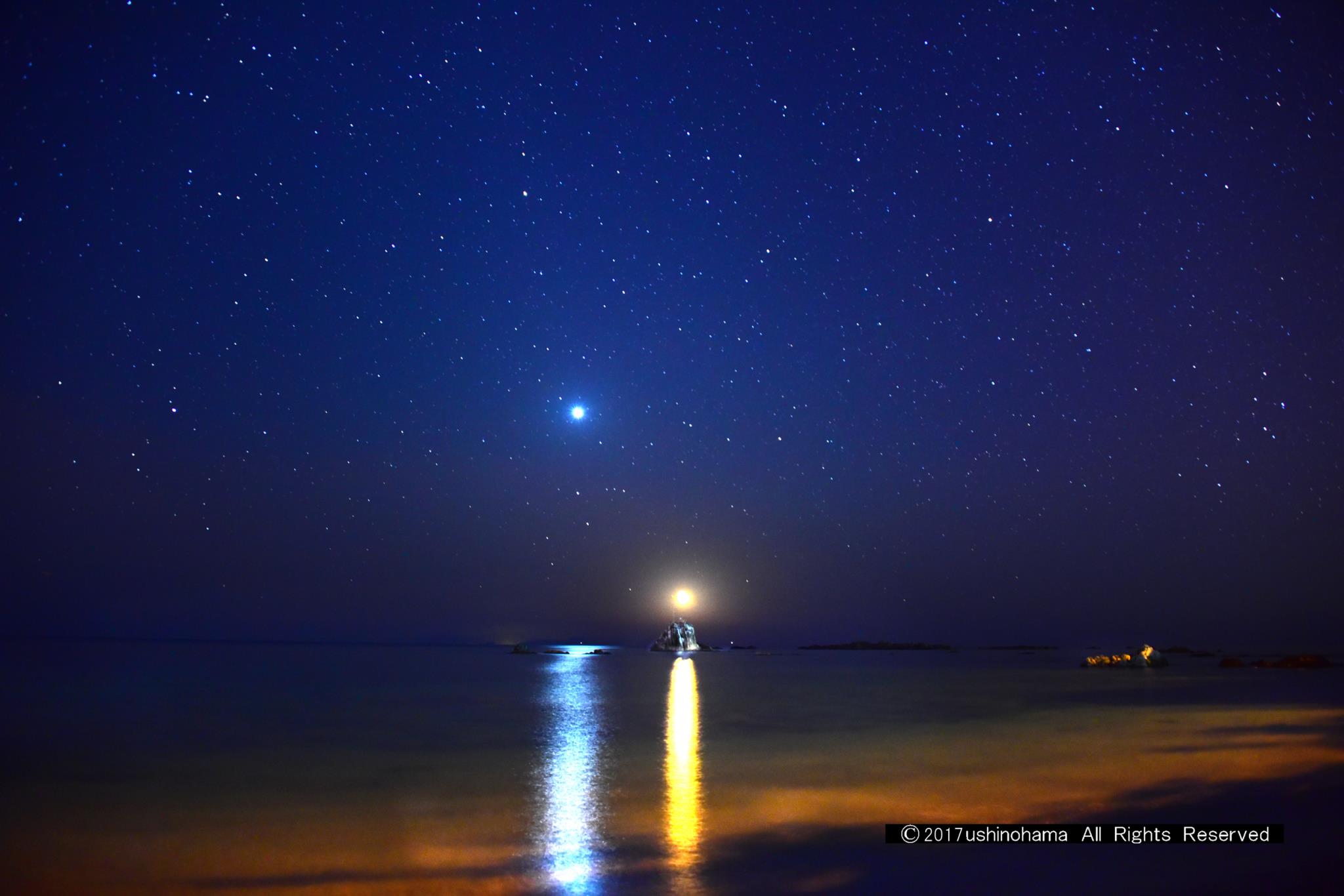 夜空が美しいですこんなに沢山のお星さまが見えるのですね 海への映り込みも・・・。