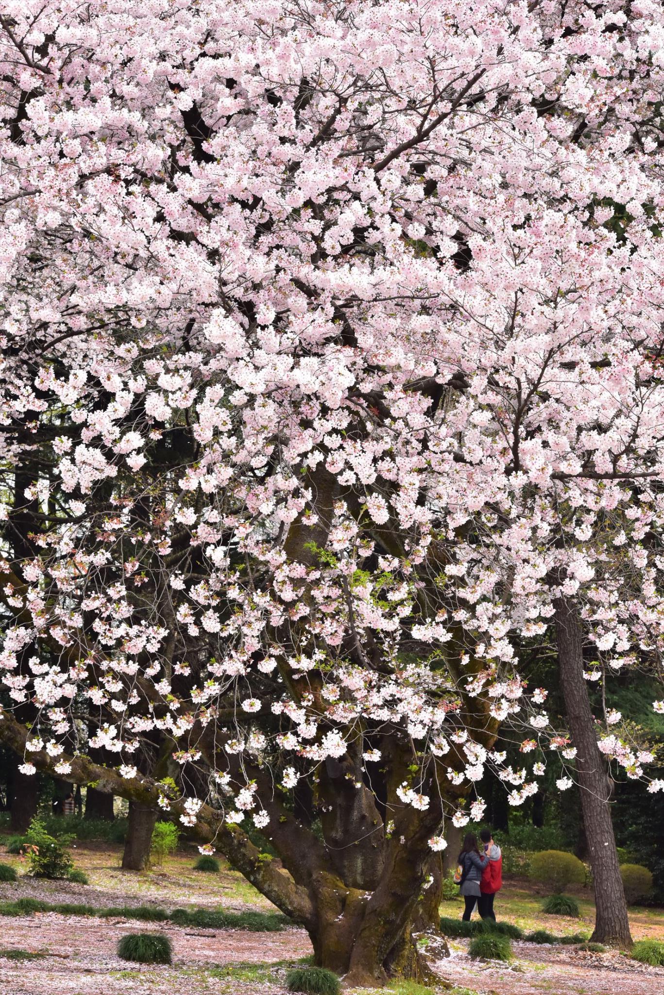 カップルが桜の木より向こうにいるため小さく写り余計に木が大きく見えますね。