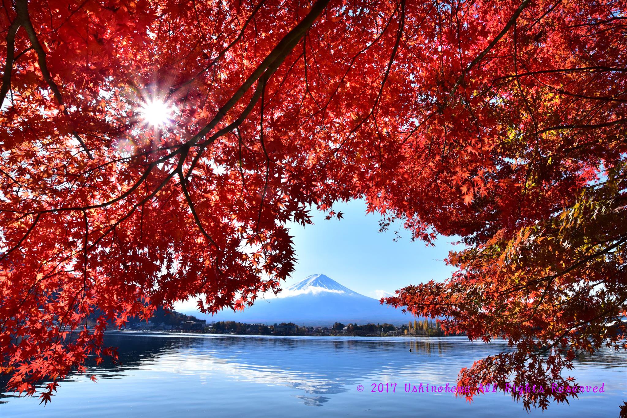 紅葉と光芒、富士山と映り込み、何と贅沢な作品でしょう。