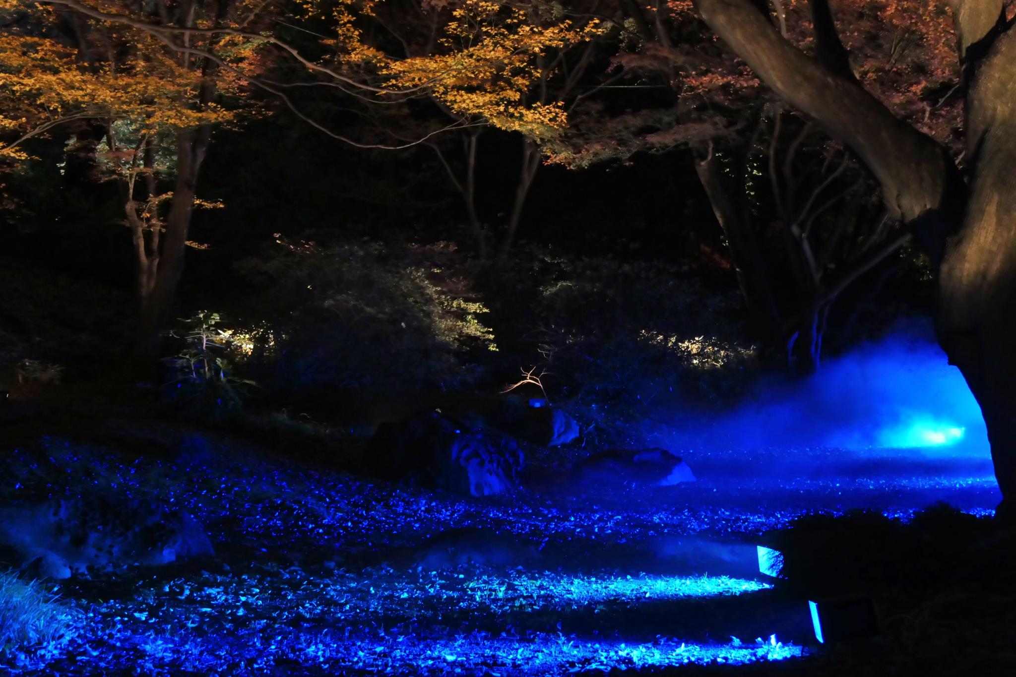 青いライトで紅葉の下を流れる川を表現したもののようでした。