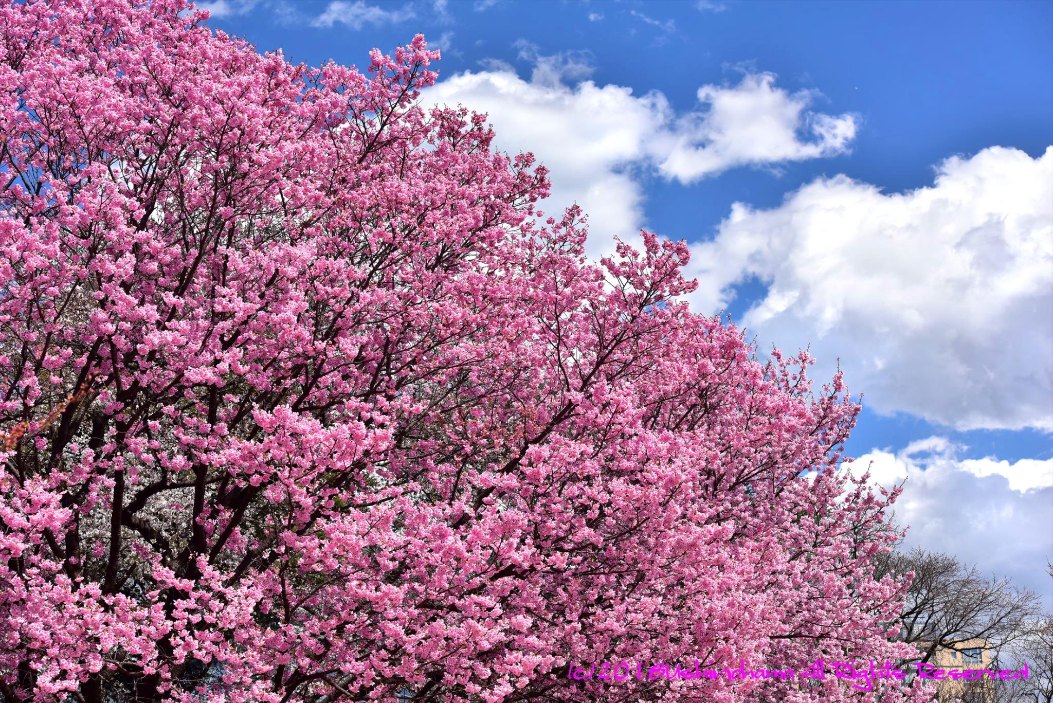 青空に赤味のある桜が映えますね。