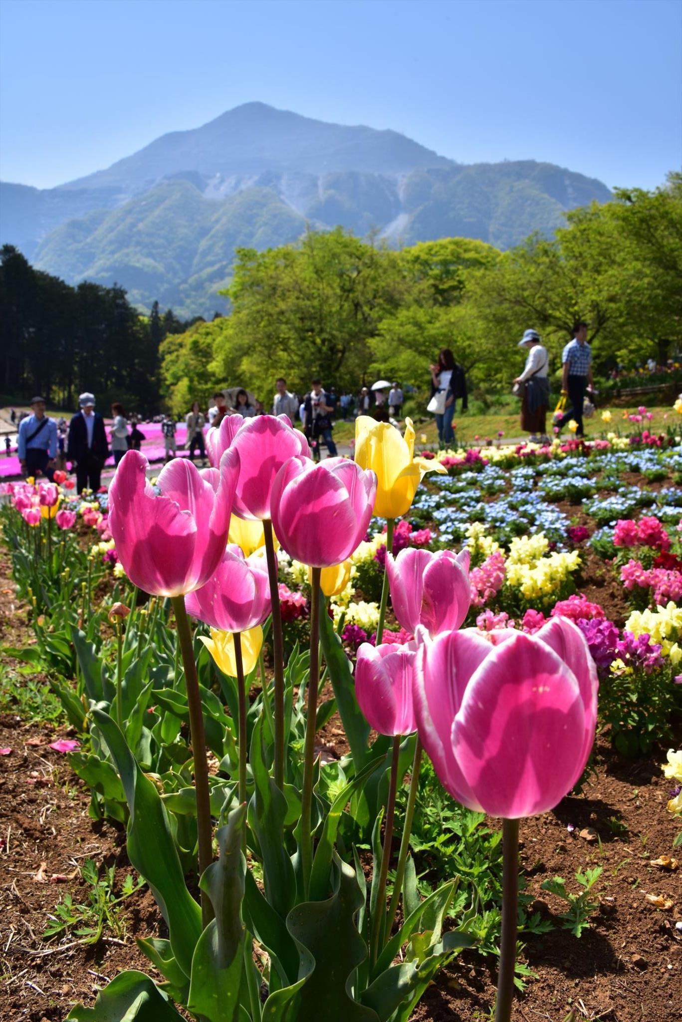 芝桜ばかりでなくチューリップも咲かせているのですね。右上に青く見えるのは?
