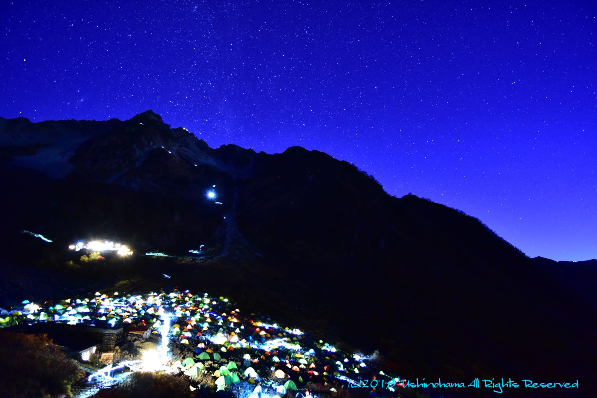 星が見えている時間、天空のテント場はすでに出発準備に灯りがともっています。山の中腹にはご来光を見ようと暗い中すでに登り始めています。