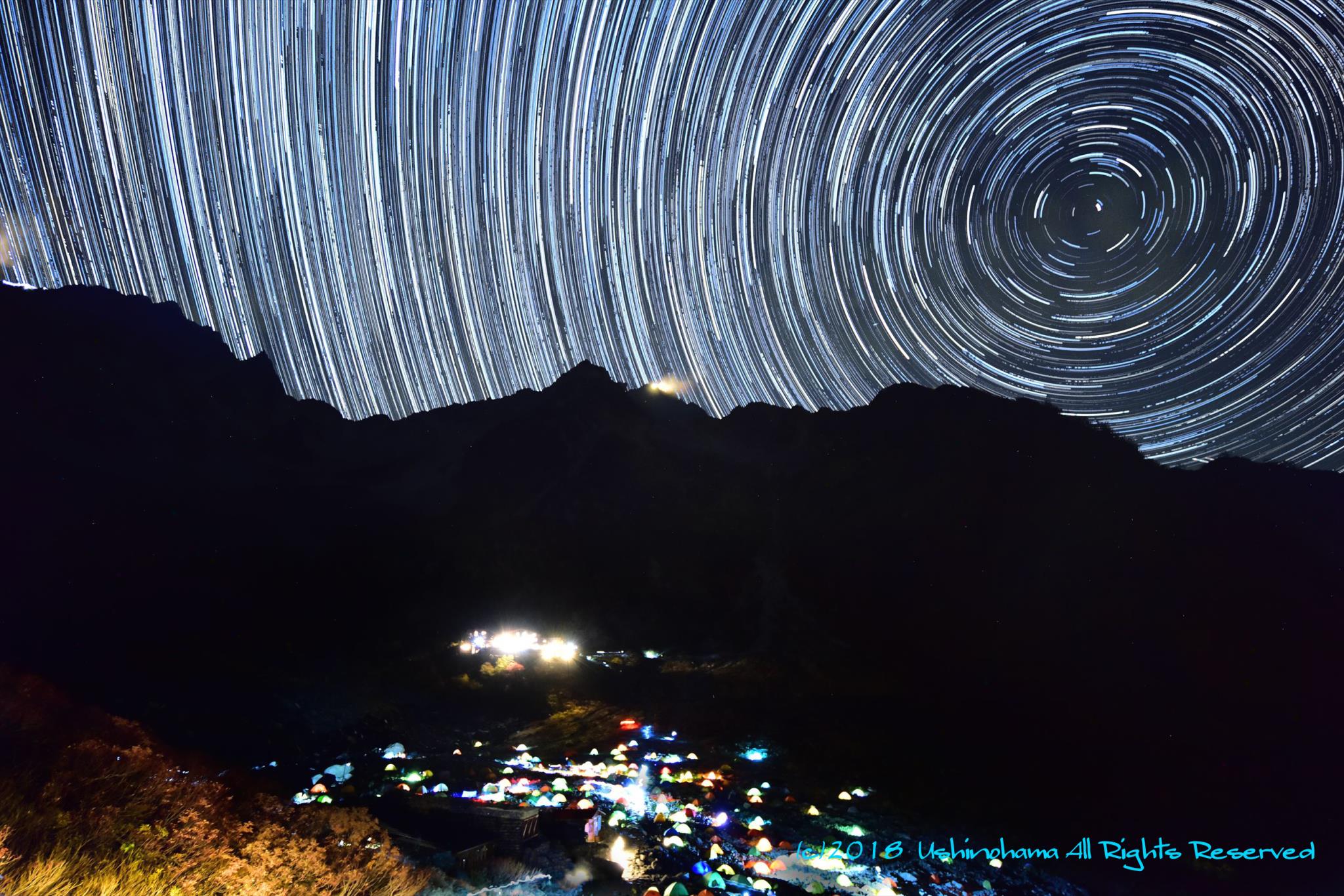 また、時々登山者のヘッドランプがレンズに直射光を入れてフレアーやゴーストが発生ししますので一枚一枚画像修正してからコンポジットしますので、この1枚仕上げるのに自宅で3時間ほど費やしました。
