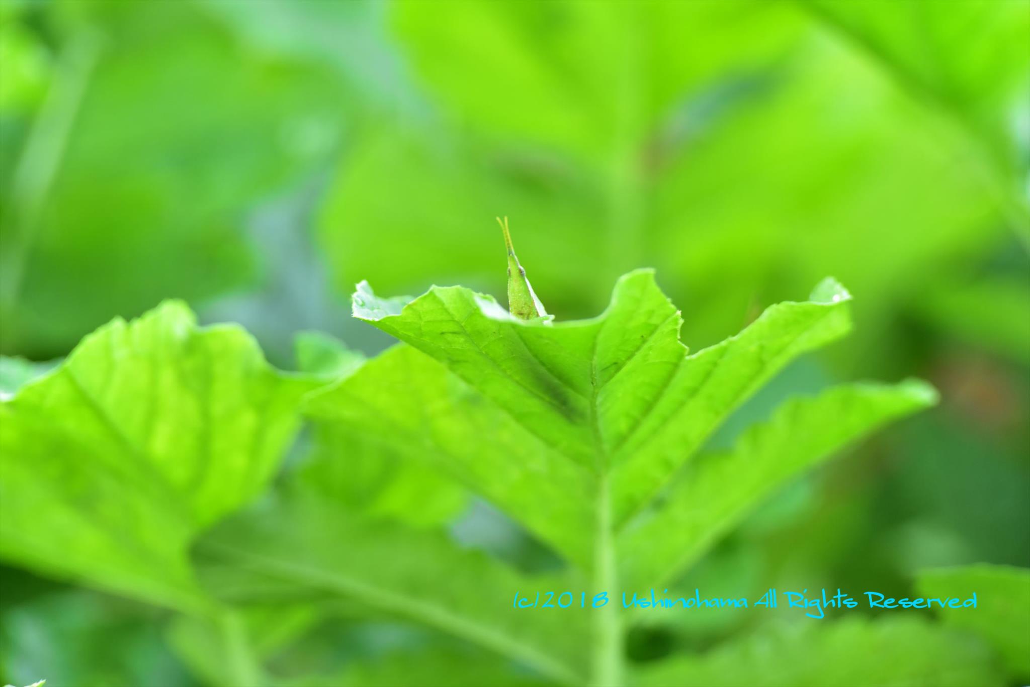 葉っぱは穴だらけ。そこから小さな角が2本と思ったらオンブバッタでしたよ。