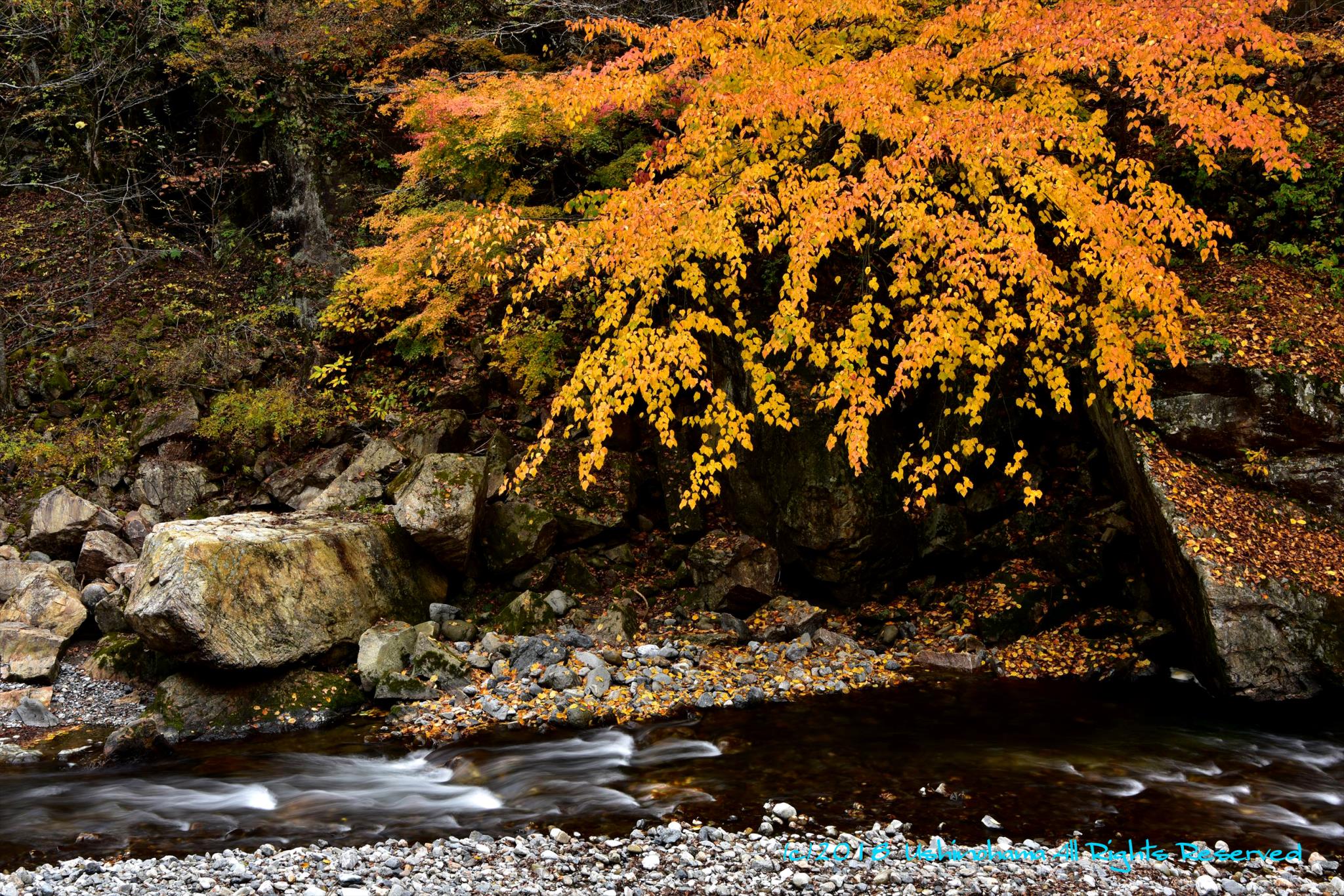 芝さんは上の黄葉だけでフレーミング、ほしざくらさんは渓流の流れを中心に持ってきていました。