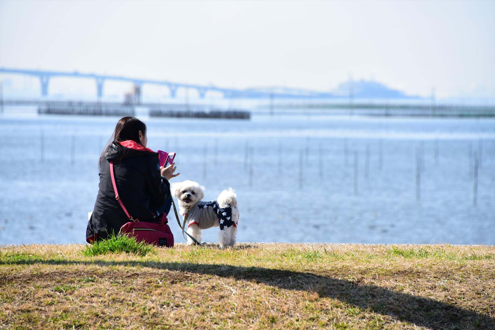 車で来て散歩をしているらしかったです。飼い主が歩くと楽し気に先へ行ったり後ろへ回ったりしていました。