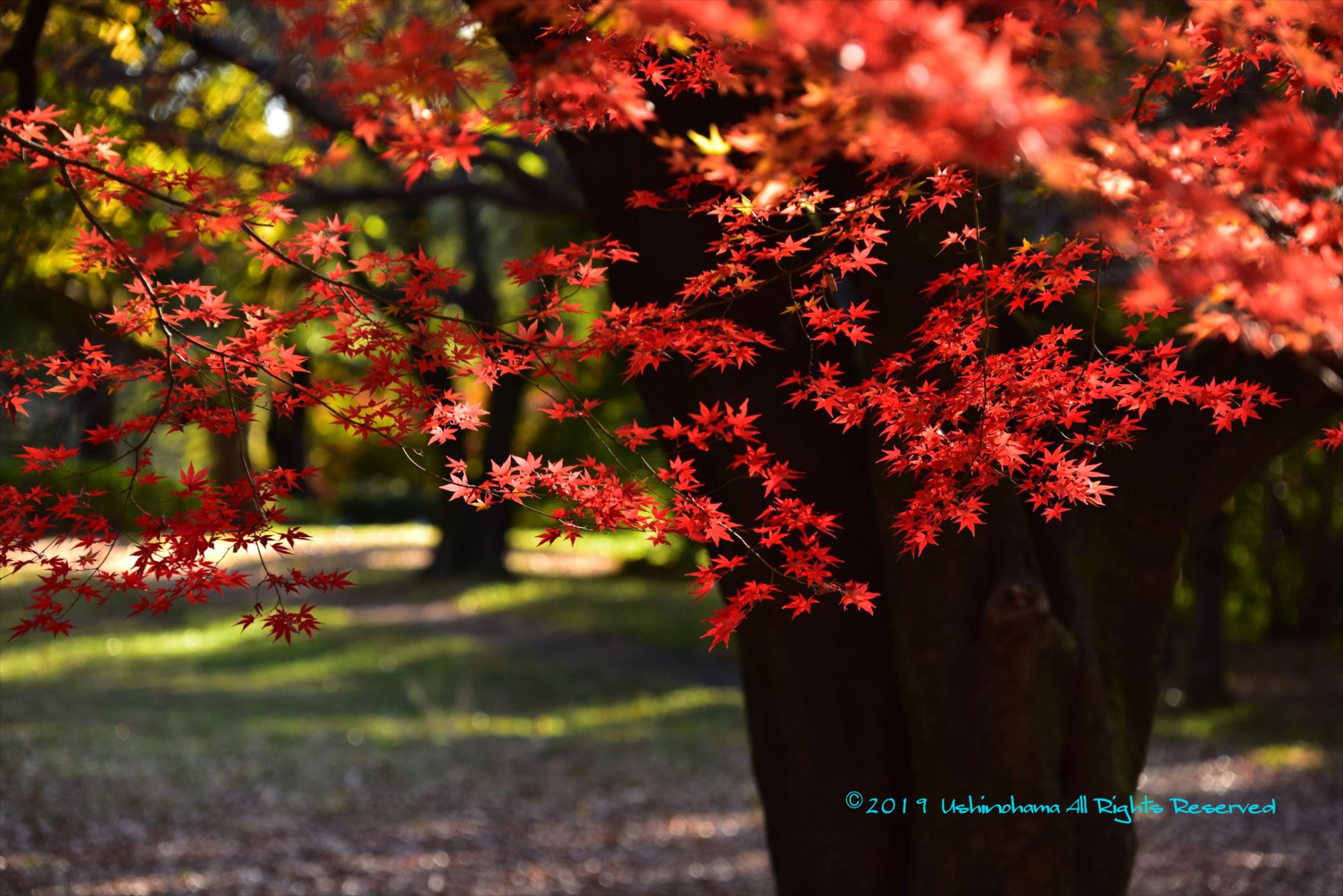このモミジは真赤でそれにこもれ日が当たり綺麗でした。