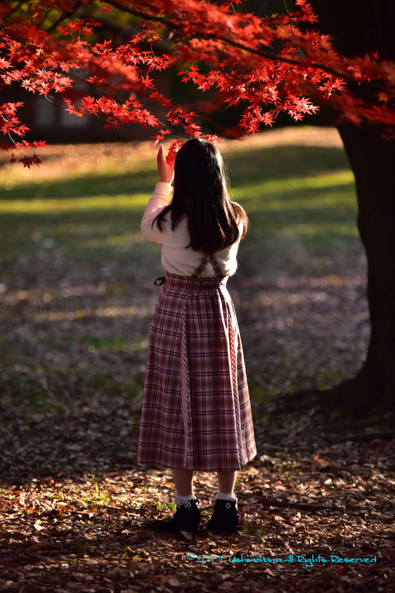 偶然見つけたならグットタイミングです。少女でしょうか?髪に陽が当たり輝いていますね!何気にもみじの葉を触れているところはモデルさんの仕草ですね。背景の日に輝いている芝生か?草か?丁度足元との光と良いですね。光は全てポイントを外していないと思います。