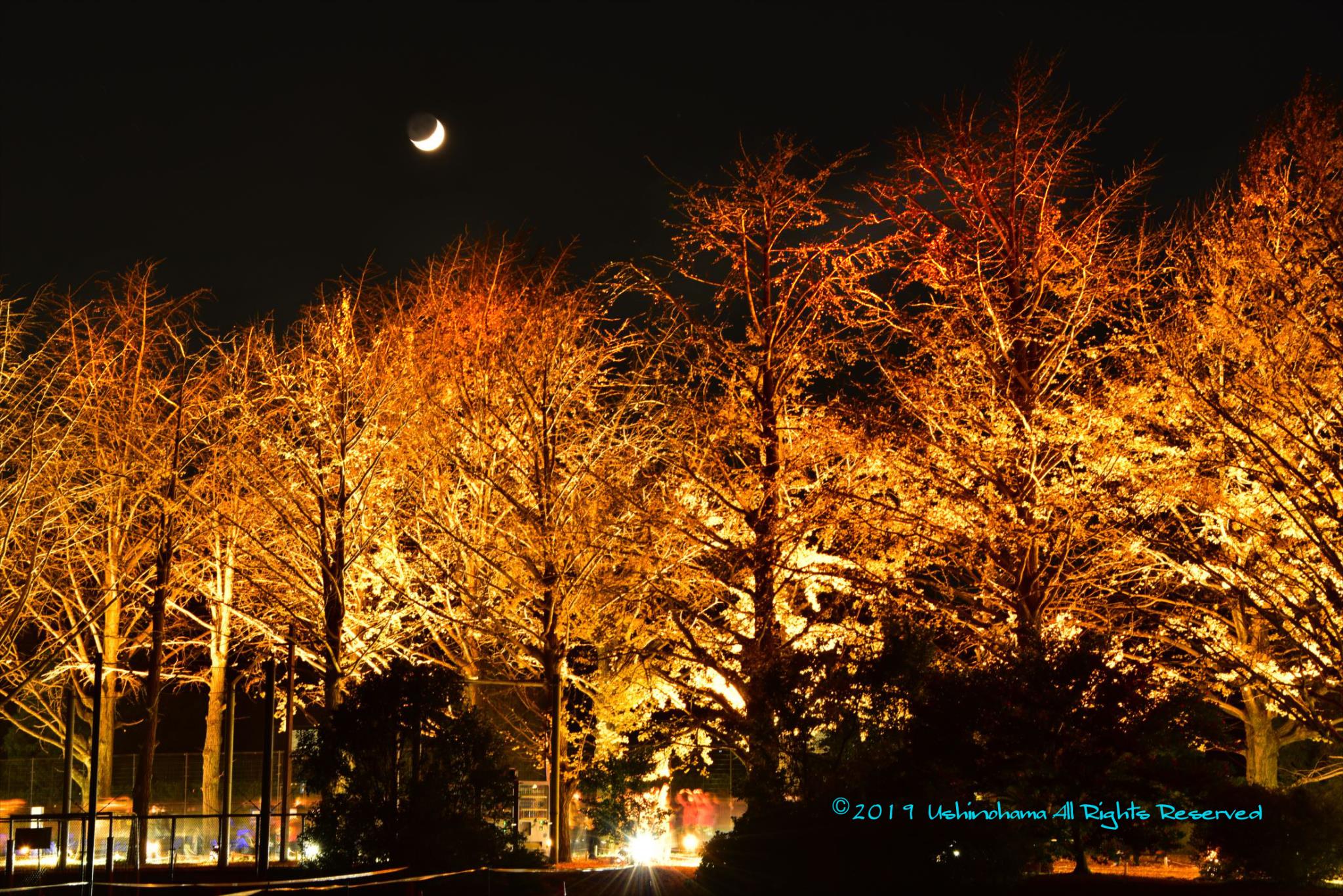 大きな三日月と下から照らすライトにイチョウが喜んでいましたね