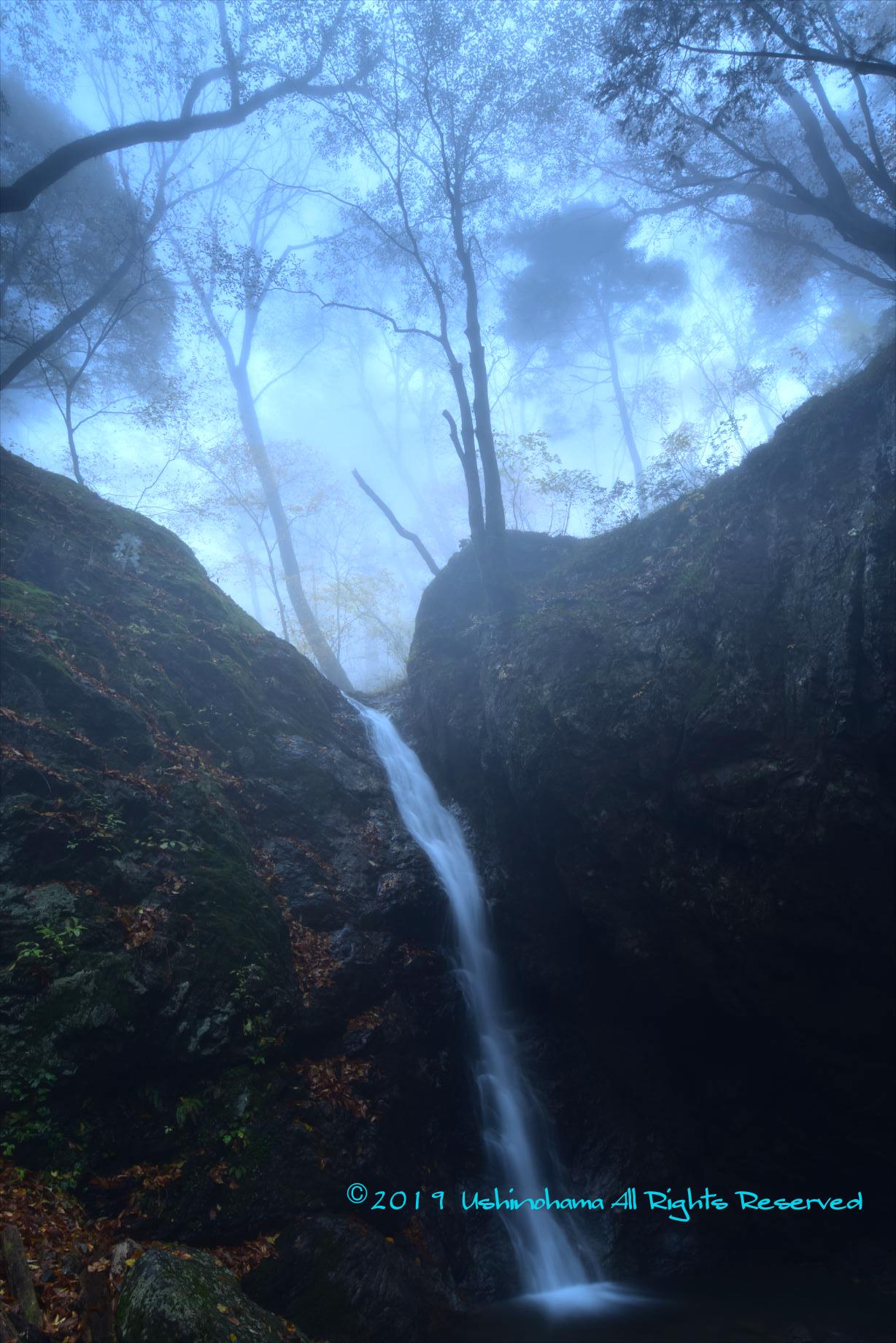 霧が一層効果を出していますね。滝と森が幻想的ですね。