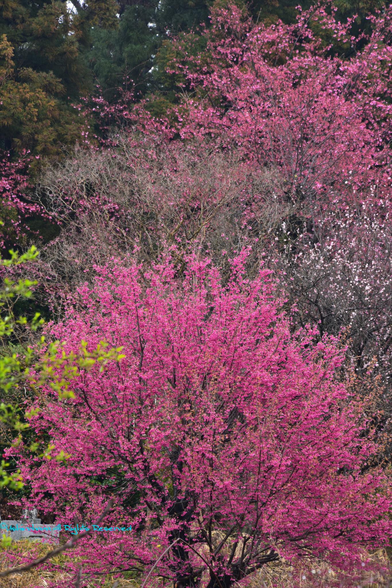 末広がりに咲く真っ赤な寒桜をバックには他種の花々が支えて一層引き立てています。