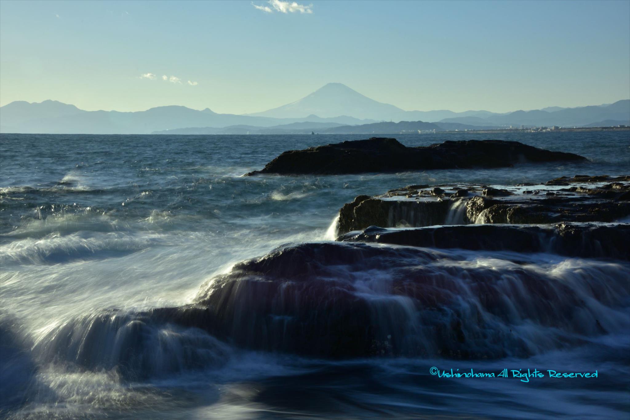 いわゆる、1/3構図ですが、もう少し空を詰めて、その分は波と岩にもっていっては、と思いました。