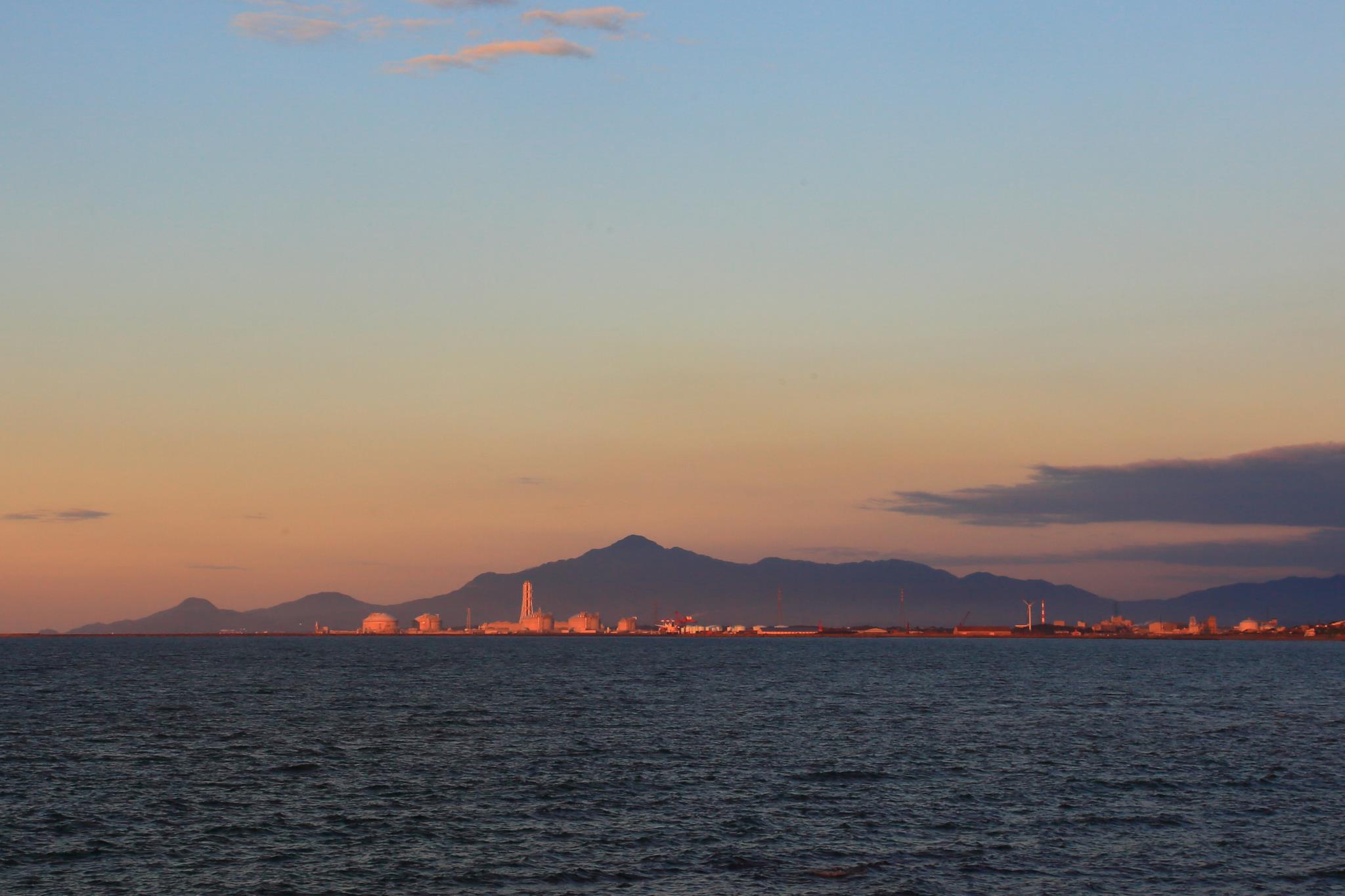米山を背景に中部電力火力発電所が夕陽に照らされています。