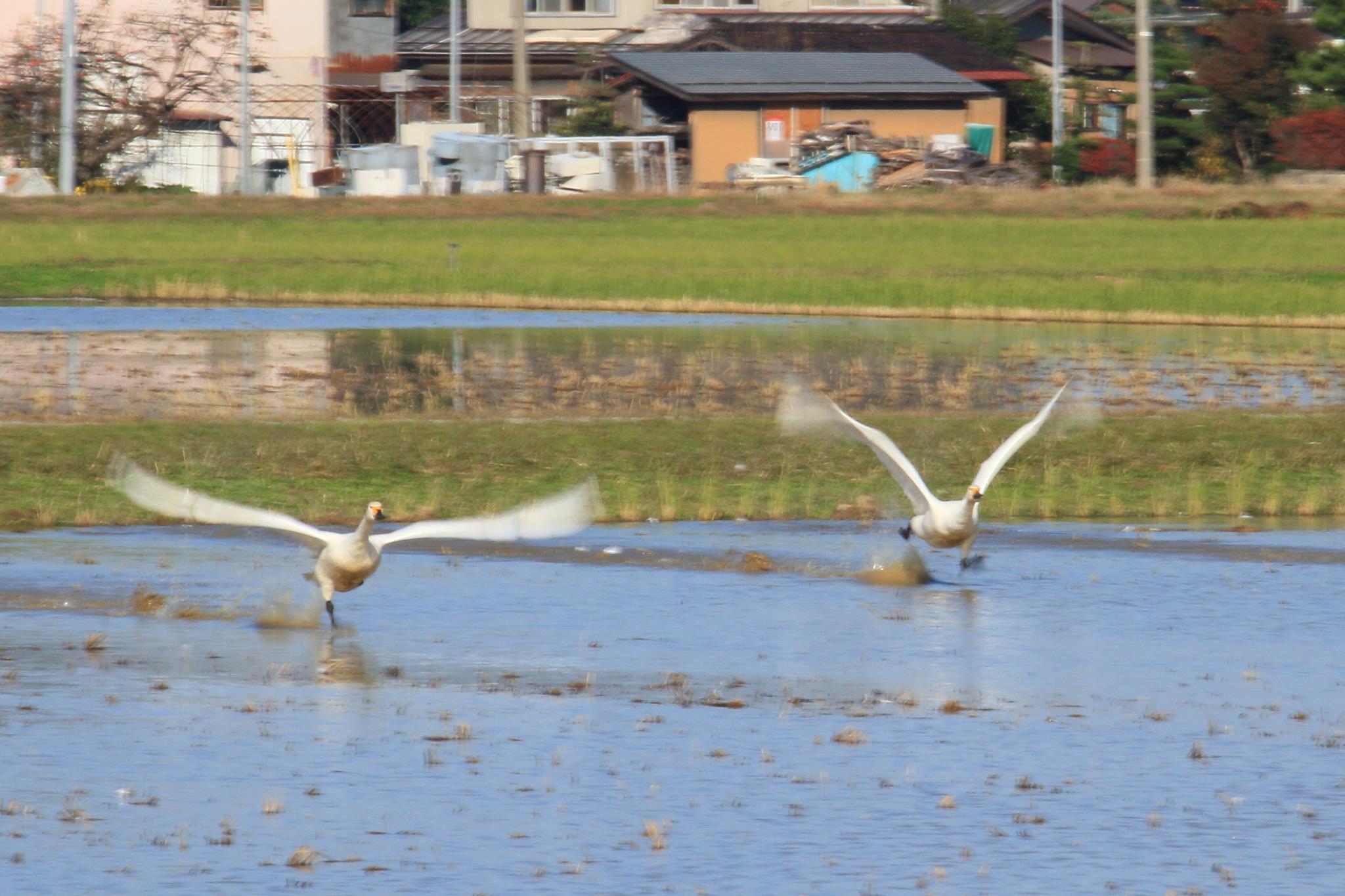 バタバタと羽を羽ばたかせ大股で水面を蹴って助走し飛び立ちます。