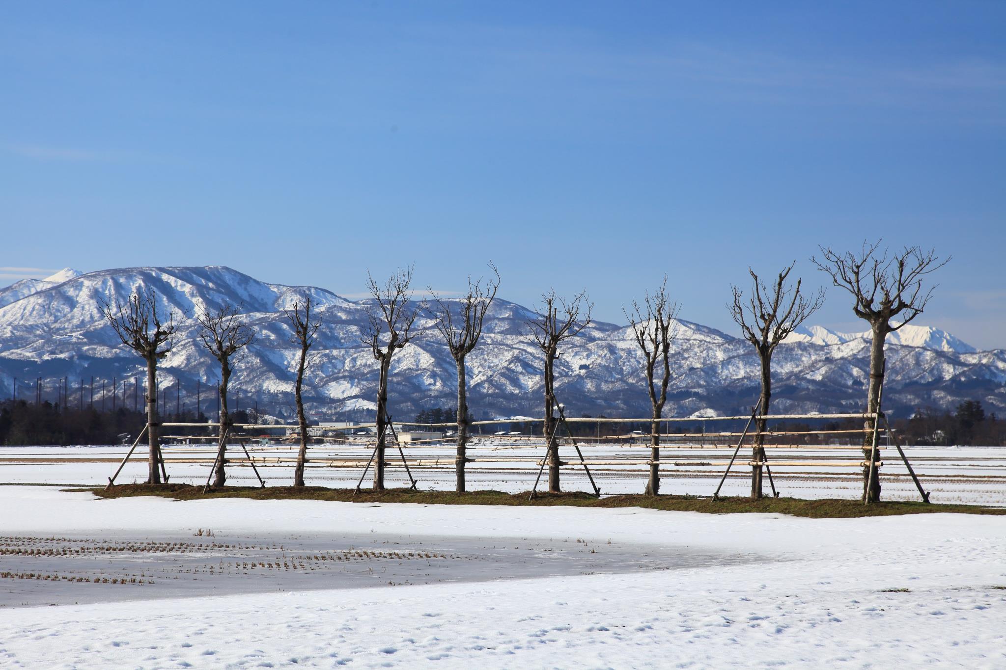 憧れの風景、はさ木の田んぼと雪山。