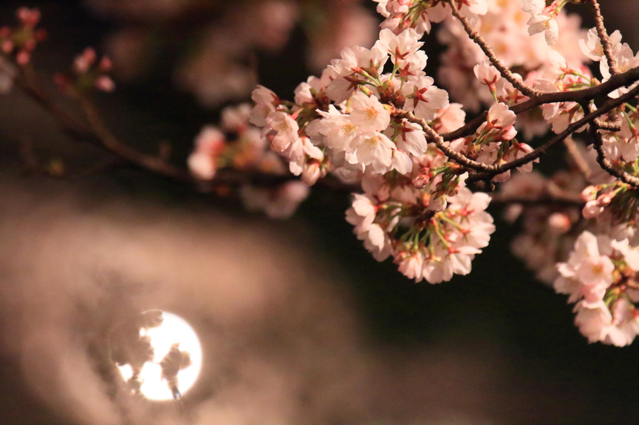 左下の丸ボケがまるでお月さんのようで、ウサギならぬ桜の花のかげですね。