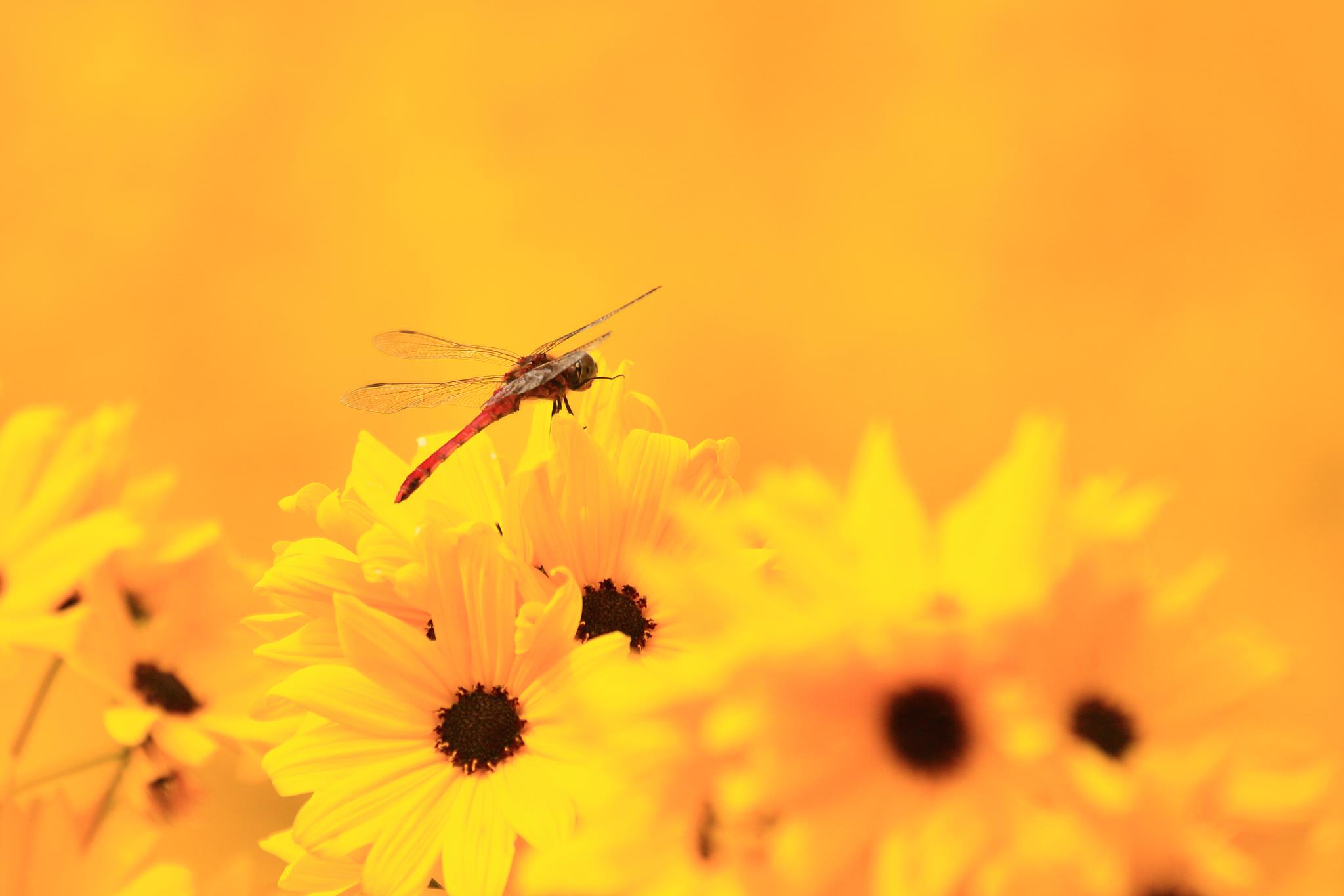 黄色い世界に、トンボも赤が黄色く染まり何か違う世界のようです。
