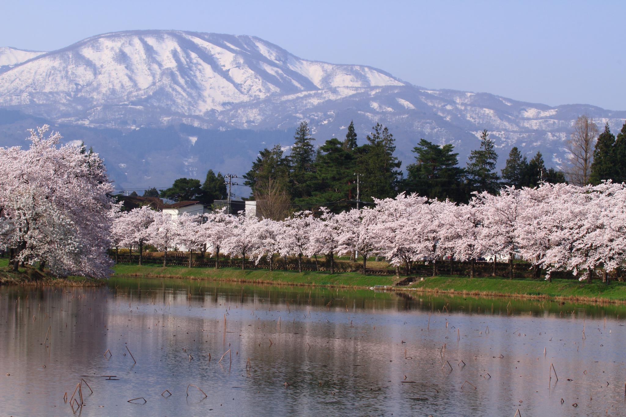 満開の桜を迎えても山にはまだ可成りの雪が残っているのですね。雪国を象徴する一幕ですね。