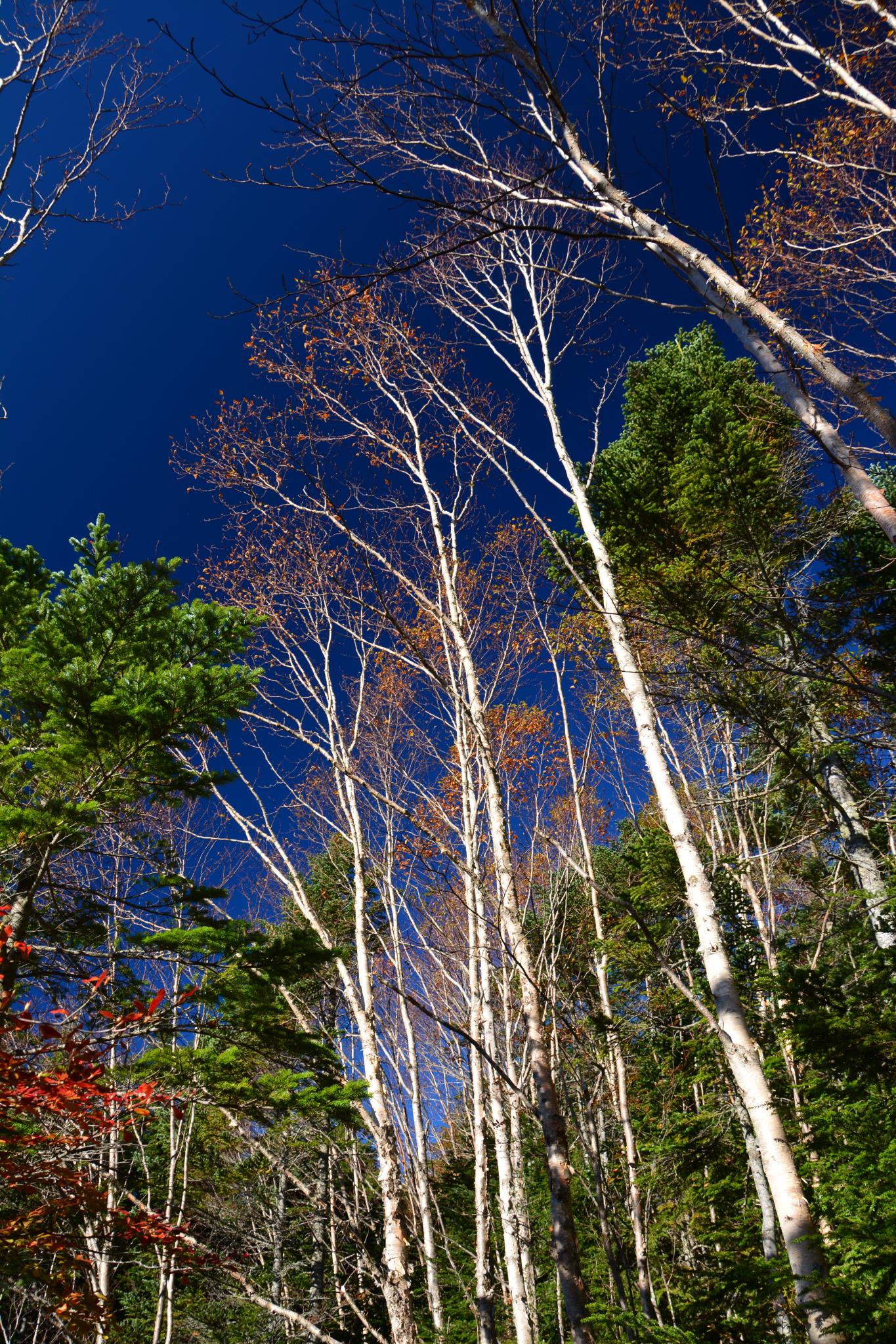 紺碧の空に届けとばかりにすくすく伸びた白樺ですね。
