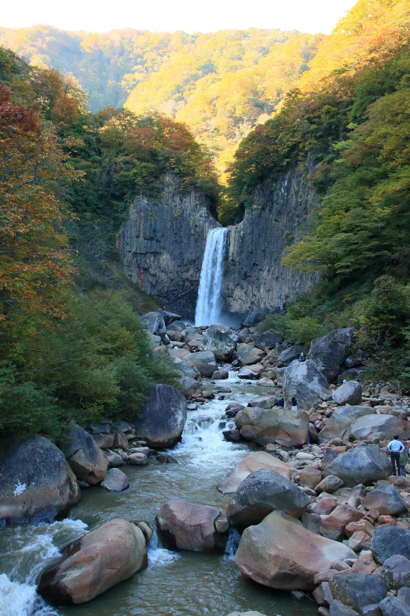 奥の黄色の色づいた山に光が当たり、手前に雄大な滝、その手前にまだ青さが残る木々とこの季節ならではの大きな景色だと思います。