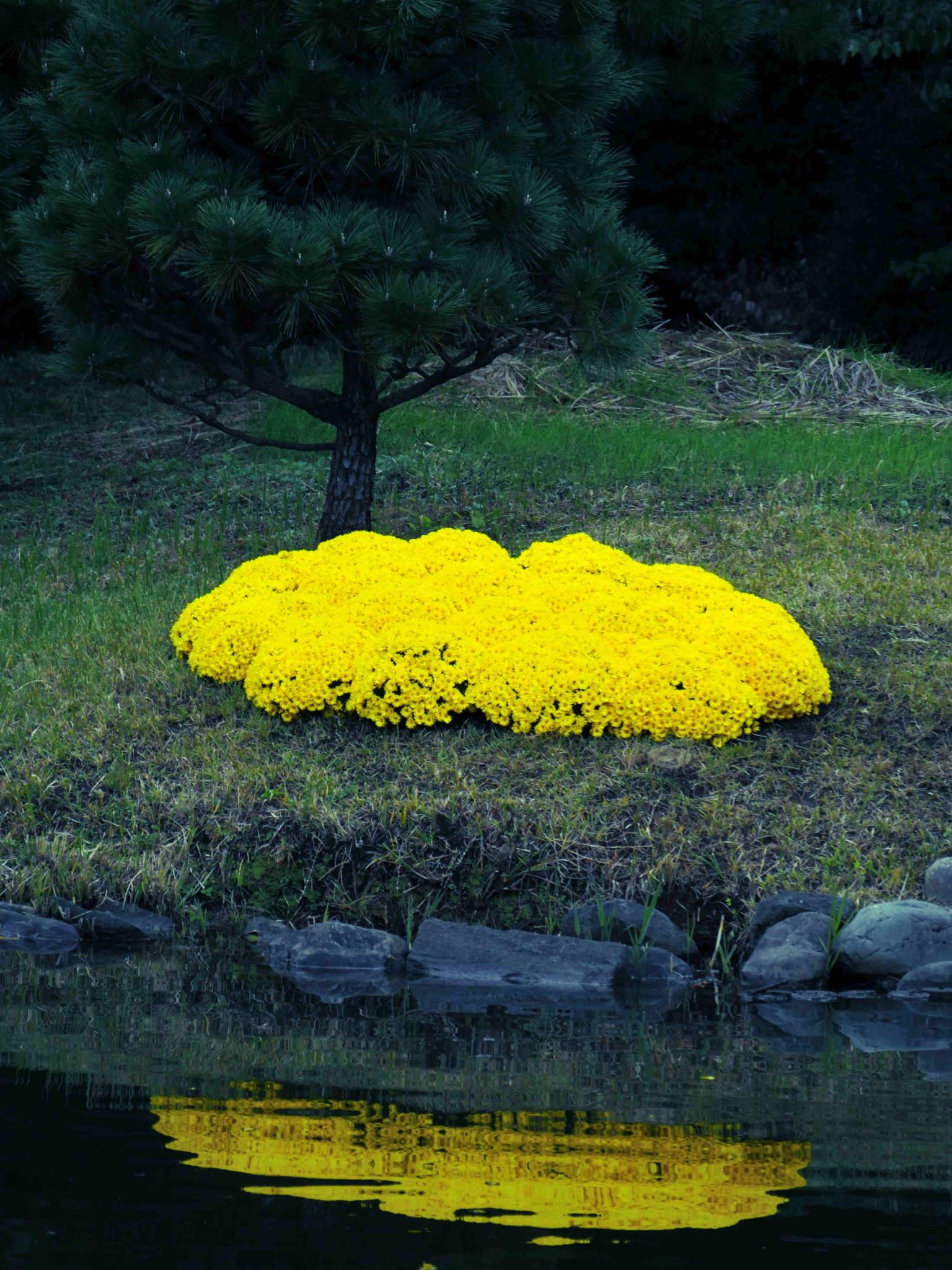 池の中の小島で日当たりのよくない場所ですが、この菊にはピッタシです。
