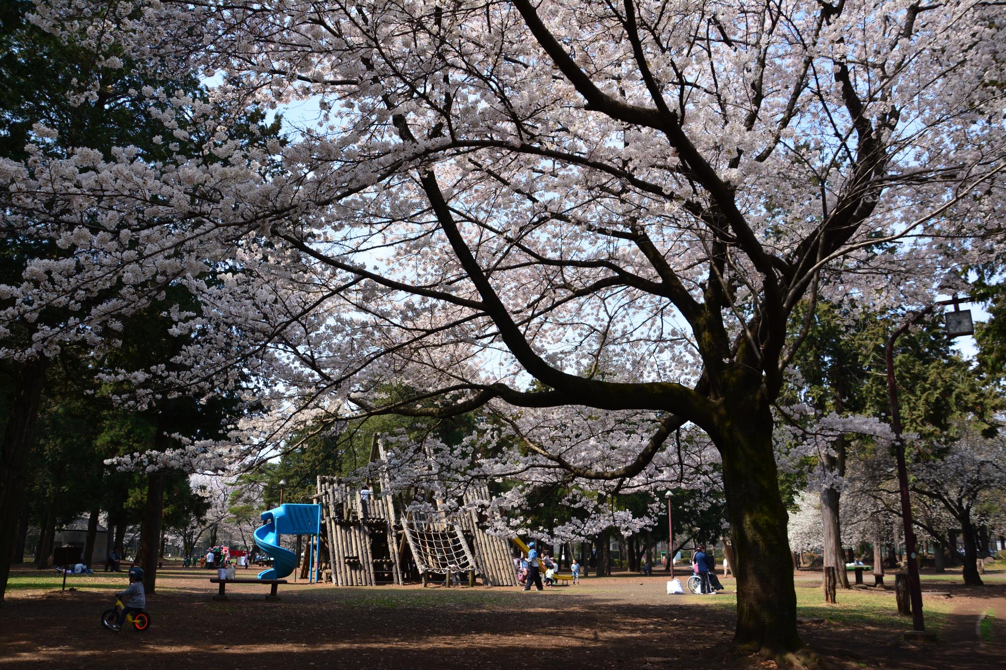 大きなソメイヨシノが元気な子ども達を見守るように咲いています。花見をするにも遊ぶにもいい場所です。