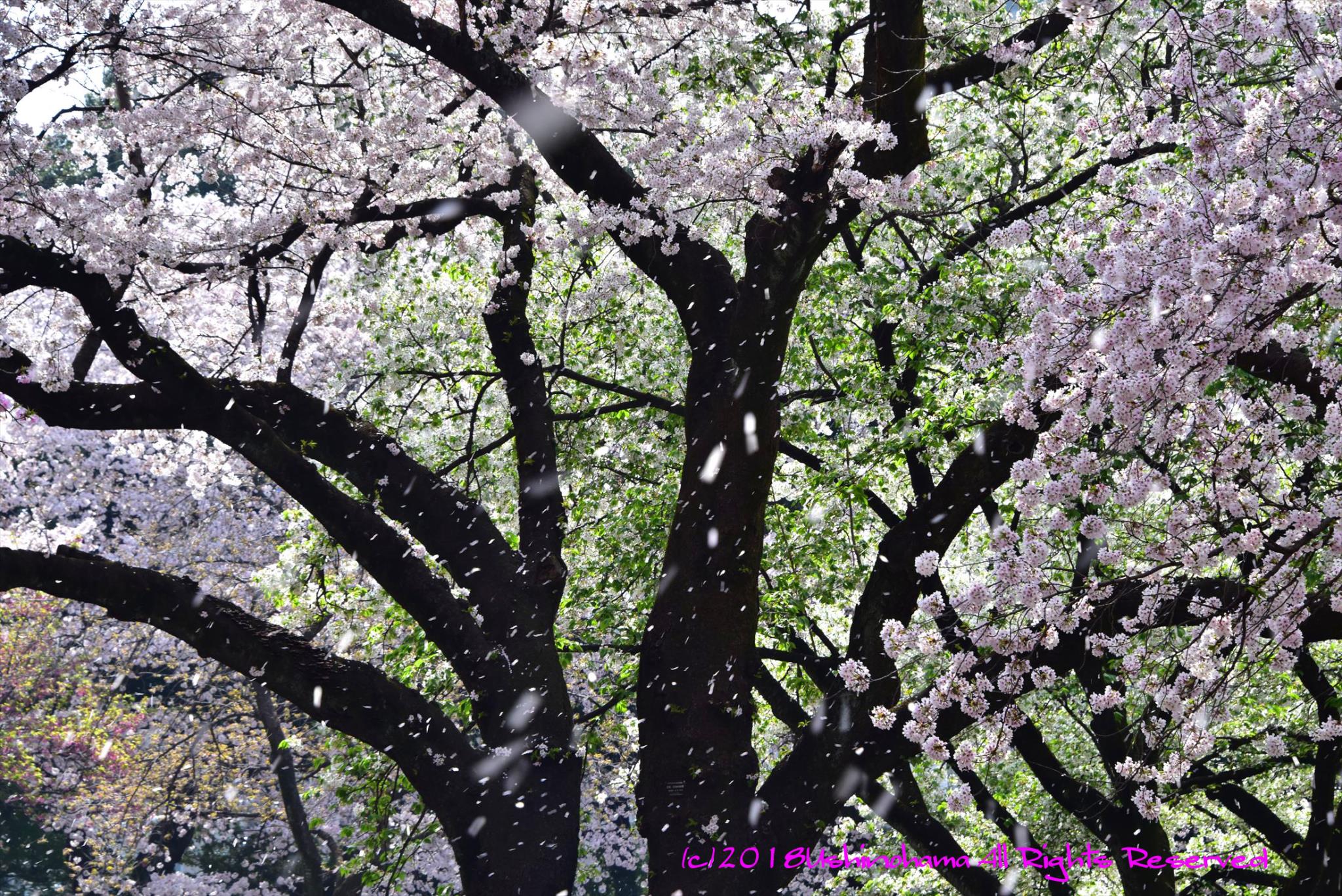 花吹雪を待っていると風が止まり、ピタッと止めて写そうとすると風が出る。