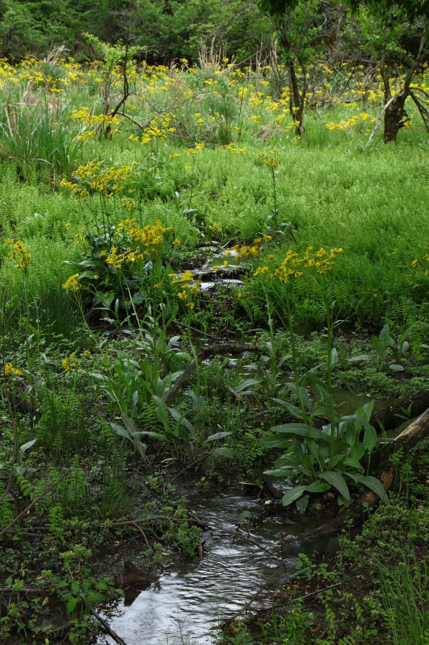 ごく小さな水の流れが奥行き感を出して、奥にサワオグルマの群生地。