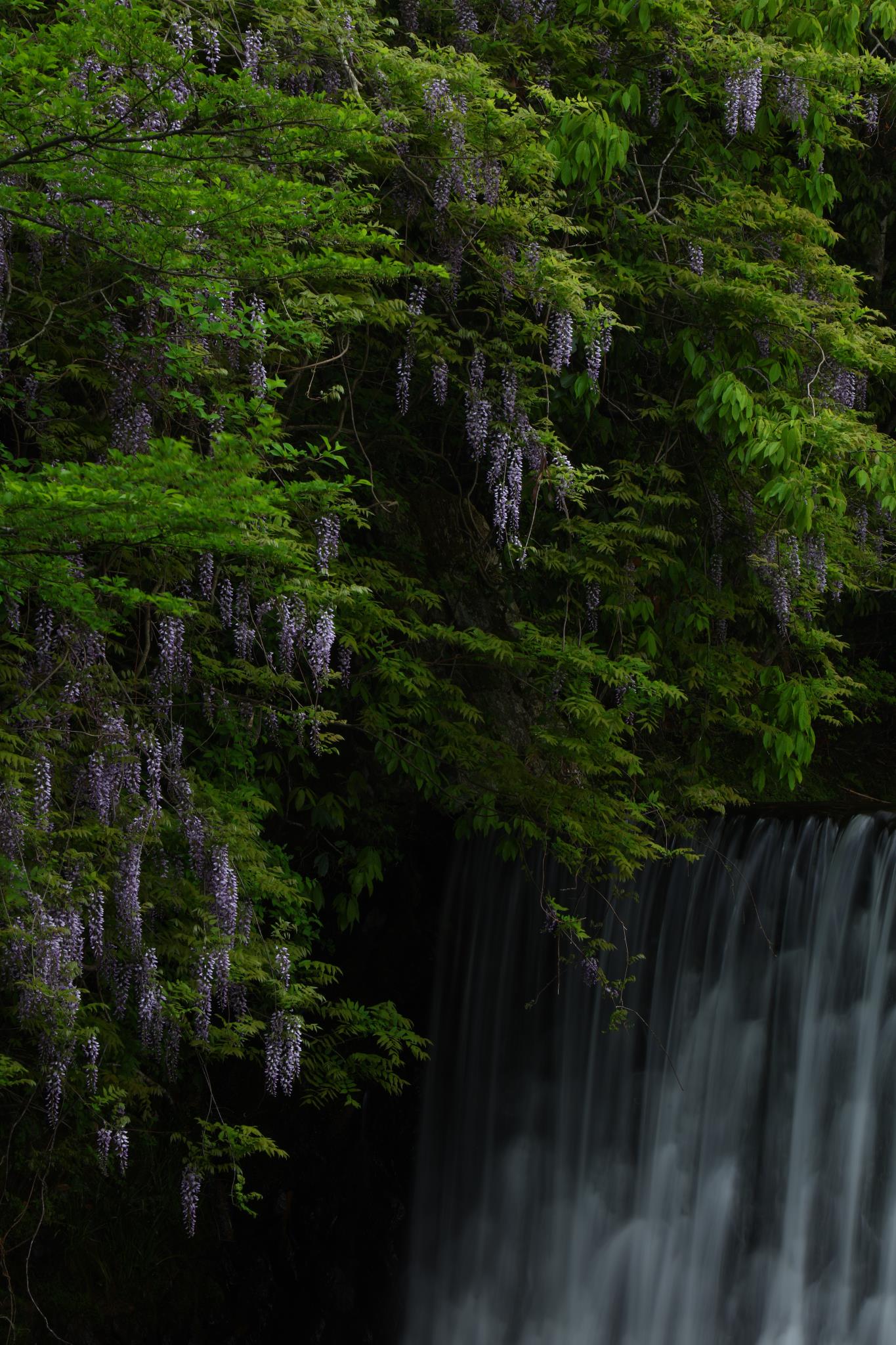 野生の藤と白水の流れ素晴らしい出来栄えです。緑の濃淡に包まれるような藤の花が印象的です。組み合わせる白水の流れも贅沢な被写体です。もう一段SSを稼いで白水の流れを白くしたいのですが、藤が揺れますか。