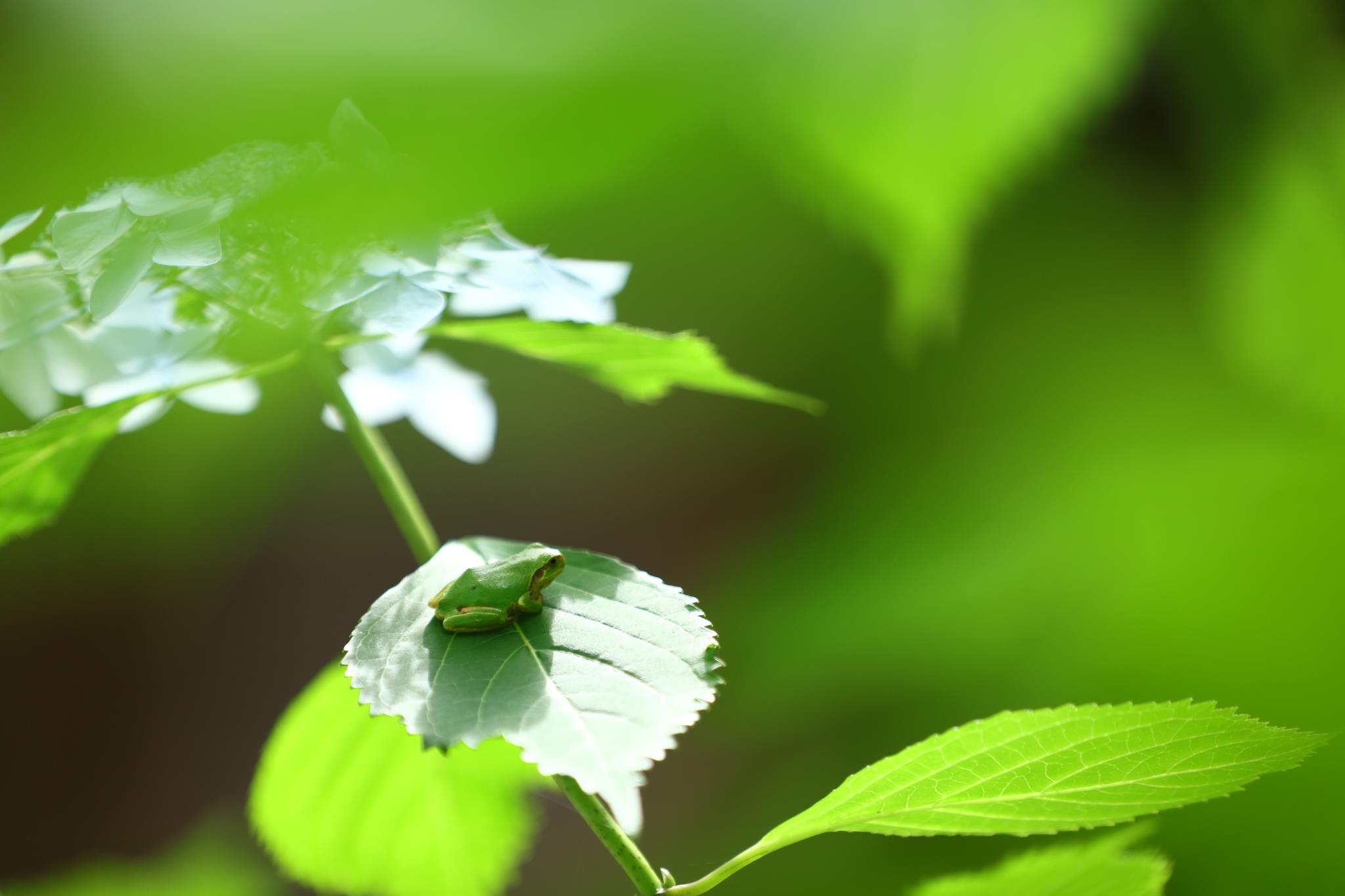 紫陽花の葉にちょこんと乗ったアマガエルは可愛いですね。