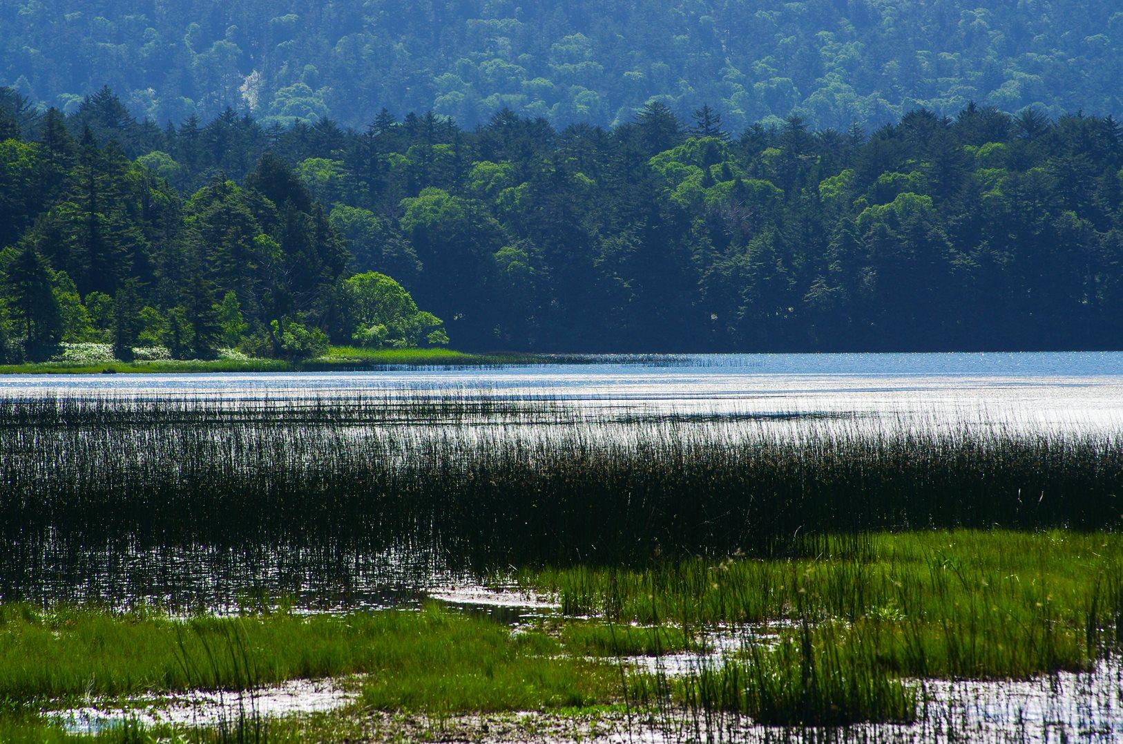 ここは湖尻で、この時間は逆光気味でした。風に揺れてさざ波があるところなどで湖面の色が変化して綺麗でした。